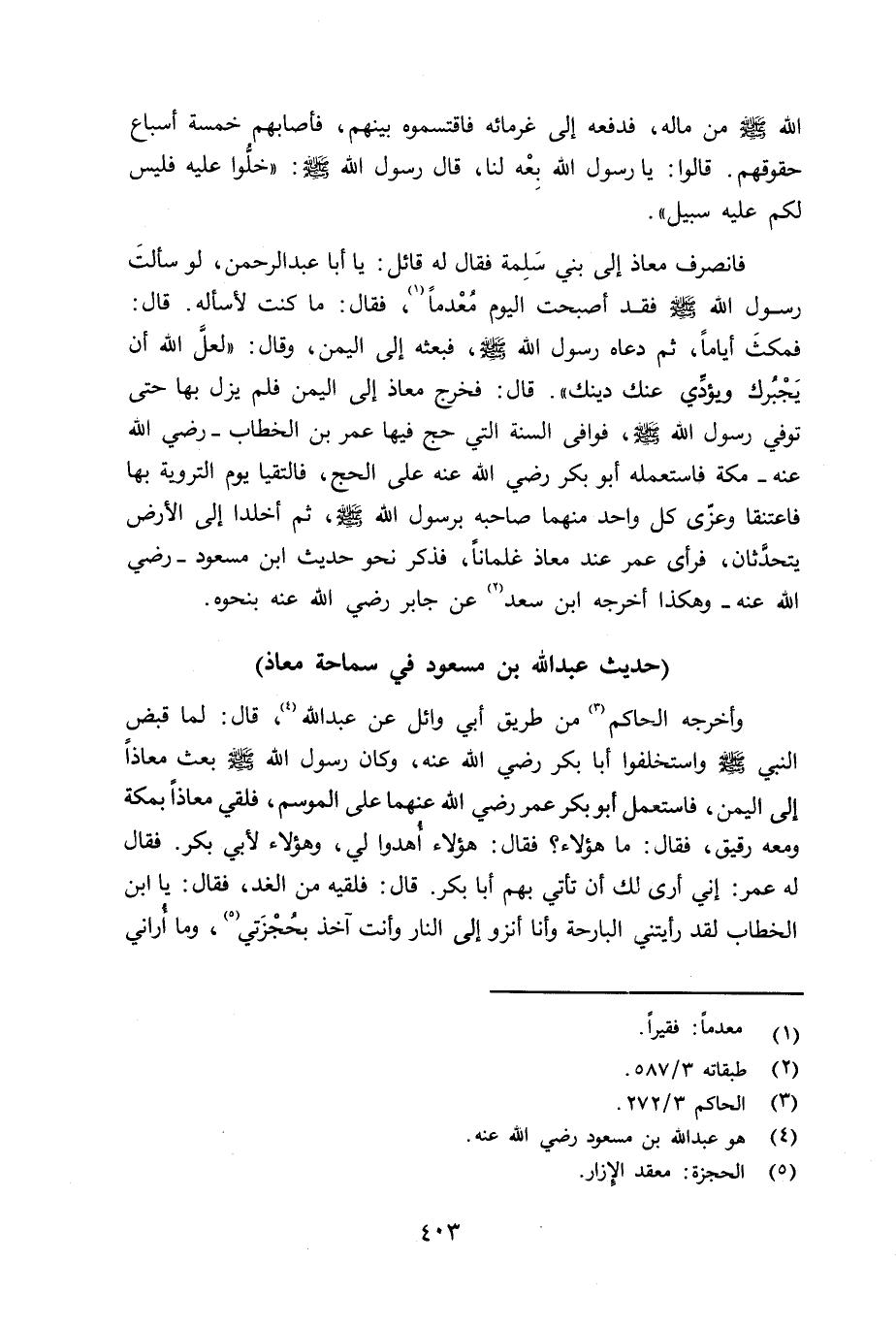 فانصرف معاذ إلى بني سَلِمة فقال له قائل: يا أبا عبد الرحمن، لو سألت رسول الله صلى الله عليه وسلم فقد أصبحت اليوم مُعْدِماً، فقال: ما كنت لأسأله. قال: فمكث أياماً، ثم دعاه رسول الله صلى الله عليه وسلم فبعثه إلى اليمن وقال: «لعلَّ الله أن يَجْبُرك ويؤدِّي عنك دينك» . قال: فخرج معاذ إلى اليمن فلم يزل بها حتى توفيت، فوافى السنة التي حج فيها عمر بن الخطاب - رضي الله عنه - مكة فاستعمله أبو بكر رضي الله عنه على الحج، فالتقيا يوم التروية بها فاعتنقا وعزّى كل واحد منهما صاحبه برسول الله صلى الله عليه وسلم ثم أخلدا إلى الأرض يتحدَّثان، فرأى عمر عند معاذ غلماناً، فذكر نحو حديث ابن مسعود - رضي الله عنه - وهكذا أخرجه ابن سعد عن جابر رضي الله عنه بنحوه.