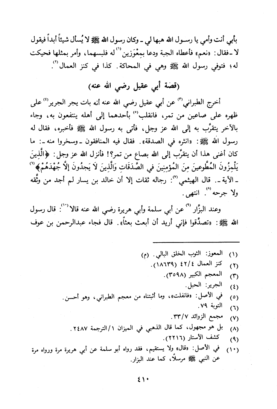 أخرج الطبراني عن أبي عقيل رضي الله عنه أنه بات يجر الجرير على ظهره على صاعين من تمر، فانفلت بأحدهما إلى أهله ينتفعون به، وجاء بالآخر يتقرَّب به إلى الله عزّ وجلّ، فأتى به رسول الله صلى الله عليه وسلم فأخبره، فقال له رسول الله صلى الله عليه وسلم «إنثره في الصدقة» . فقال فيه المنافقون - وسخروا منه -: ما كان أغنى هذا أن يتقرَّب إلى الله بصاع من تمر؟ فأنزل الله عزّ وجلّ: {الَّذِينَ يَلْمِزُونَ الْمُطَّوّعِينَ مِنَ الْمُؤْمِنِينَ فِي الصَّدَقَاتِ وَالَّذِينَ لاَ يَجِدُونَ إِلاَّ جُهْدَهُمْ} (التوبة: 79) - الآية -. وقال الهيثمي: رجاله ثقات إلا أن خالد بن يسار لم أجد من وثّقه ولا جرَّحه. انتهى.
