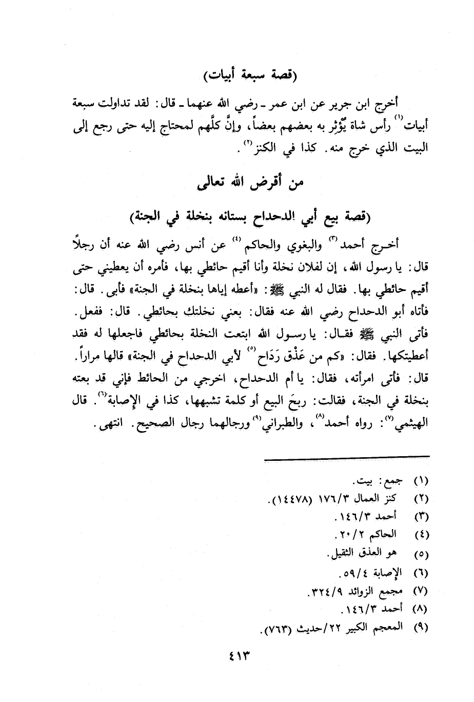 أخرج أحد والبغوي، والحاكم عن أنس رضي الله عنه أن رجلاً قال: يا رسول الله، إن لفلان نخلة وأنا أقيم حائطي بها، فأمره أن يعطيني حتى أقيم حائطي بها. فقال له النبي صلى الله عليه وسلم «أعطه إِياها بنخلة في الجنة» فأبى. قال: فأتاه أبو الدحداح رضي الله عنه فقال: بعني نخلتك بحائطي. قال: ففعل. فأتى النبي صلى الله عليه وسلم فقال: يا رسول الله إبتعت النخلة لحائطي فاجعلها له فقد أعطيتكها. فقال: «كم من عَذْق رَدَاح لأبي الدحداح في الجنة» قالها مراراً. قال: فأتى إمرأته فقال: يا أم الدحداح، إخرجي من الحائط فإني قد بعته بنخلة في الجنة، فقالت: ربح البيع أو كلمة تشبهها، كذا في الإِصابة. قال الهيثمي: رواه أحمد، والطبراني ورجالهما رجال الصحيح. انتهى.