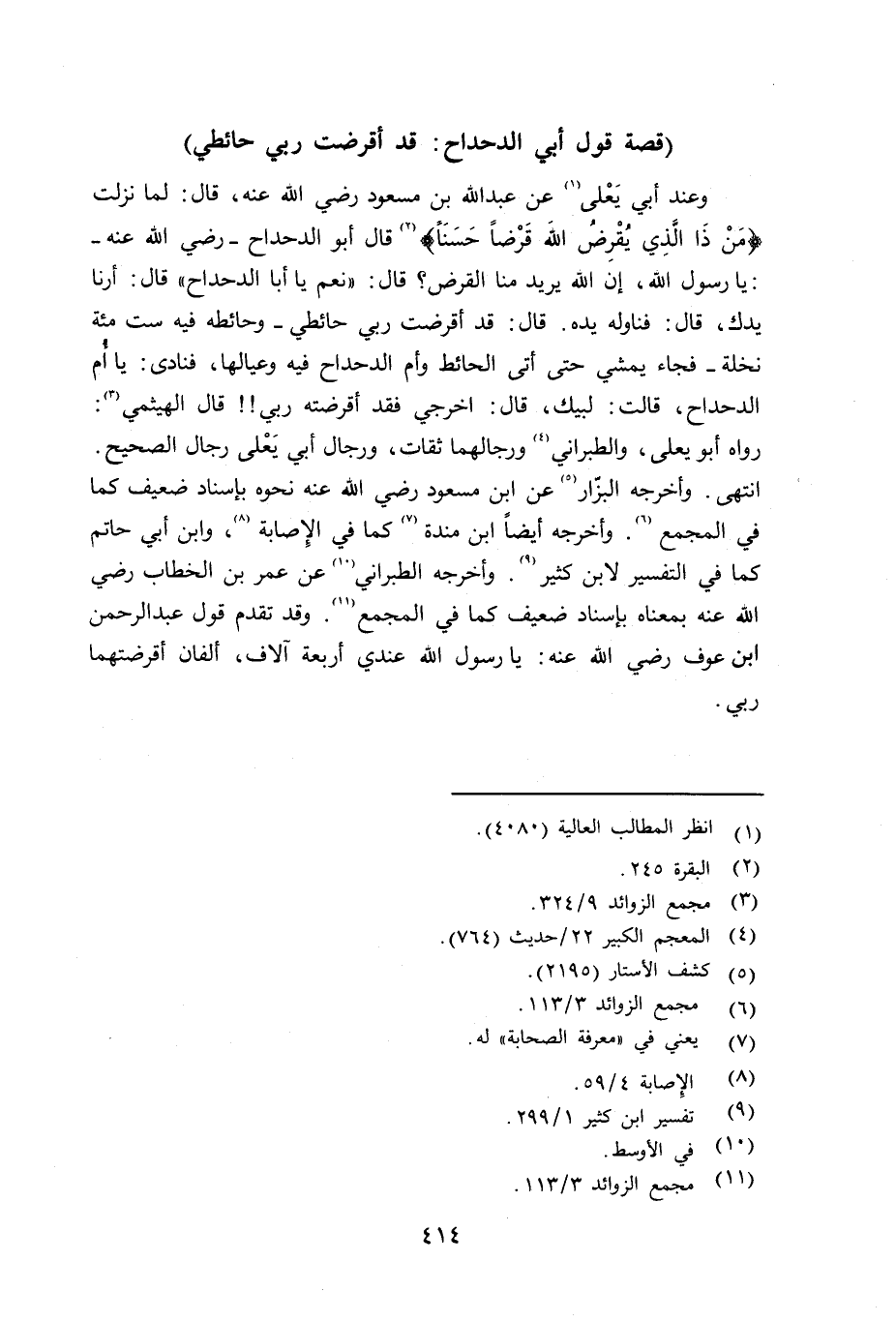 وعند أبي يَعْلى عن عبد الله بن مسعود رضي الله عنه قال: لما نزلت: {مَّن ذَا الَّذِى يُقْرِضُ اللَّهَ قَرْضًا حَسَنًا} (البقرة: 245) قال أبو الدحداح - رضي الله عنه -: يا رسول الله، إن الله يريد منا القرض؟ قال: «نعم يا أبا الدحداح» قال: أرنا يدك، قال: فناوله يده. قال: قد أقرضت ربي حائطي - وحائطه فيه ست مائة نخلة - فجاء يمشي حتى أتى الحائط وأم الدحداح وفيه وعيالها، فنادى: «يا أُم الدحداح، قالت: لبيك، قال: إخرجي فقد أقرضته ربي قال الهيثمي: رواه أبو يعلى، والطبراني ورجالهما ثقات، ورجال أبي يَعْلى رجال الصحيح. انتهى وأخرجه البزّار عن ابن مسعود رضي الله عنه نحوه بإسناد ضعيف كما في المجمع. وأخرجه أيضاً ابن منده كما في الإِصابة. وابن أبي حاتم كما في التفسير لابن كثير. وأخرج الطبراني عن عمر بن الخطاب رضي الله عنه بمعناه بإسناد ضعيف كما في المجمع وقد تقدم قول عبد الرحمن بن عوف رضي الله عنه: يا رسول الله عندي أربعة آلاف، ألفان أقرضتهما ربي.