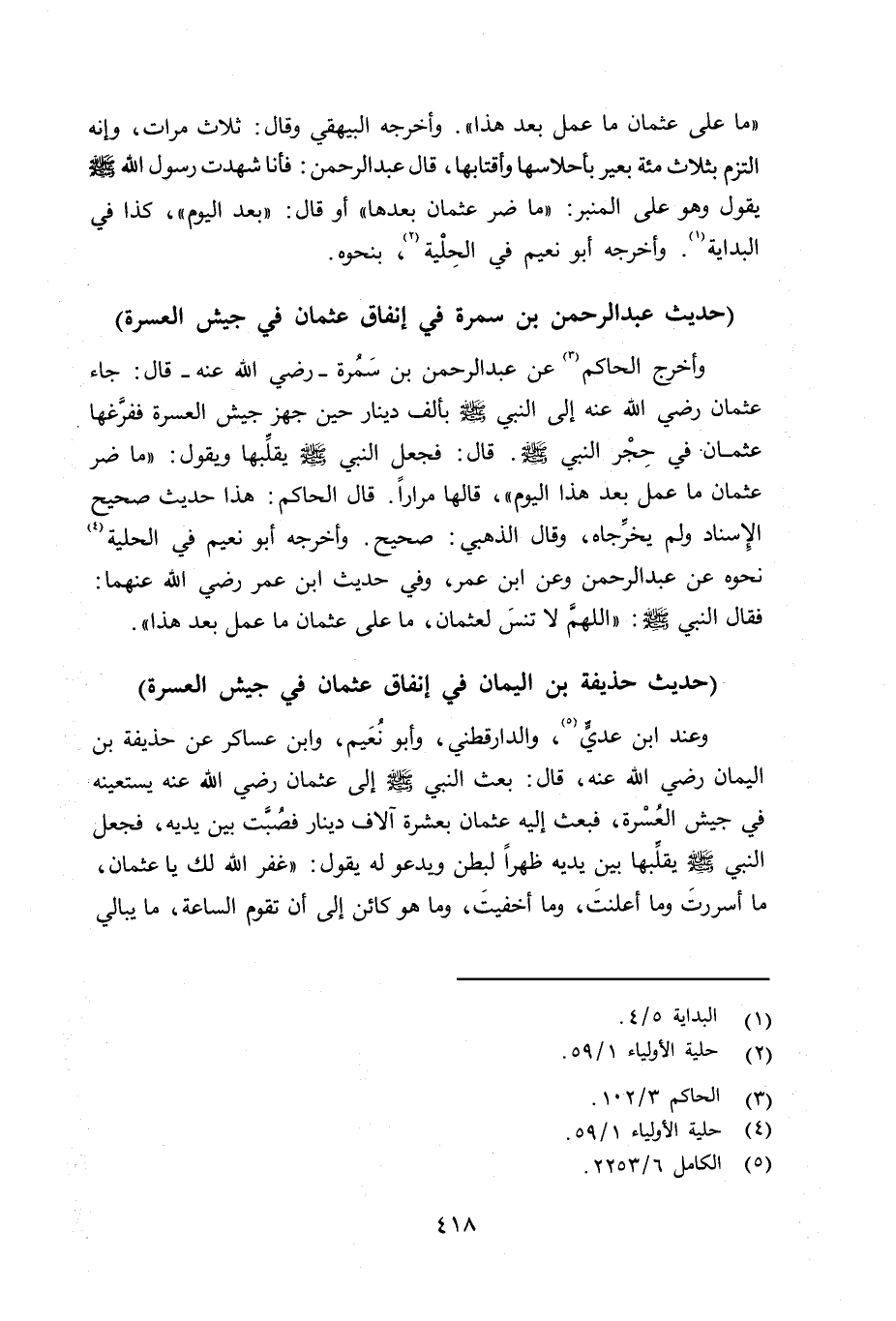 وأخرج الحاكم عن عبد الرحمن بن سَمُرة - رضي الله عنه - قال: جاء عثمان رضي الله عنه إلى النبي صلى الله عليه وسلم بألف دينار حين جهز جيش العسرة ففرَّغها عثمان في حِجْر النبي صلى الله عليه وسلم قال: فجعل النبي صلى الله عليه وسلم يقلِّبها ويقول: «ما ضر عثمان مع عمل بعد هذا اليوم» ، قالها مراراً. قال الحاكم: هذا حديث صحيح الإِسناد ولم يخرِّجاه، وقال الذهبي: صحيح. وأخرجه أبو نعيم في الحلية نحو عن عبد الرحمن وعن ابن عمر، وفي حديث ابن عمر رضي الله عنهما: فقال النبي صلى الله عليه وسلم «اللهمَّ لا تنسَ لعثمان، ما على عثمان ما عمل بعد هذا» .