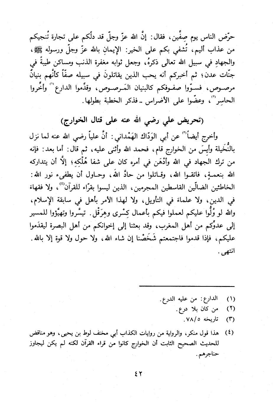 وأخرج أيضاً عن أبي الوَدّاك الهمْداني: أنَّ علياً رضي الله عنه لما نزل بالنُّخَيلة وأيِسَ من الخوارج قام، فحمد الله وأثنى عليه، ثم قال: أما بعد: فإنه من ترك الجهاد في الله وأدْهَن في أمره كان على شفا هُلْكِهِ؛ إلا أن يتداركه الله بنعمة، فاتقوا الله وقاتلوا من حادّ الله، حاول أن يطفىء نور الله الخاطئين الضالّين القاسطين المجرمين، الذين ليسوا بقرّاء للقرآن، ولا فقهاءَ في الدين، ولا علماءَ في التأويل، ولا لهذا الأمر بأهل في سابقة الإِسلام، والله لو وُلُّوا عليكم لعملوا فيكم بأعمال كِسْرى وهِرَقْل. تيسَّروا وتهيَّؤوا للمسير إلى عدوِّكم من أهل المغرب، وقد بعثنا إِلى إخوانكم من أهل البصرة ليقدَموا عليكم، فإذا قدموا فاجتمعتم شَخَصْنا إن شاء الله، ولا حول ولا قوة إلا بالله. انتهى.