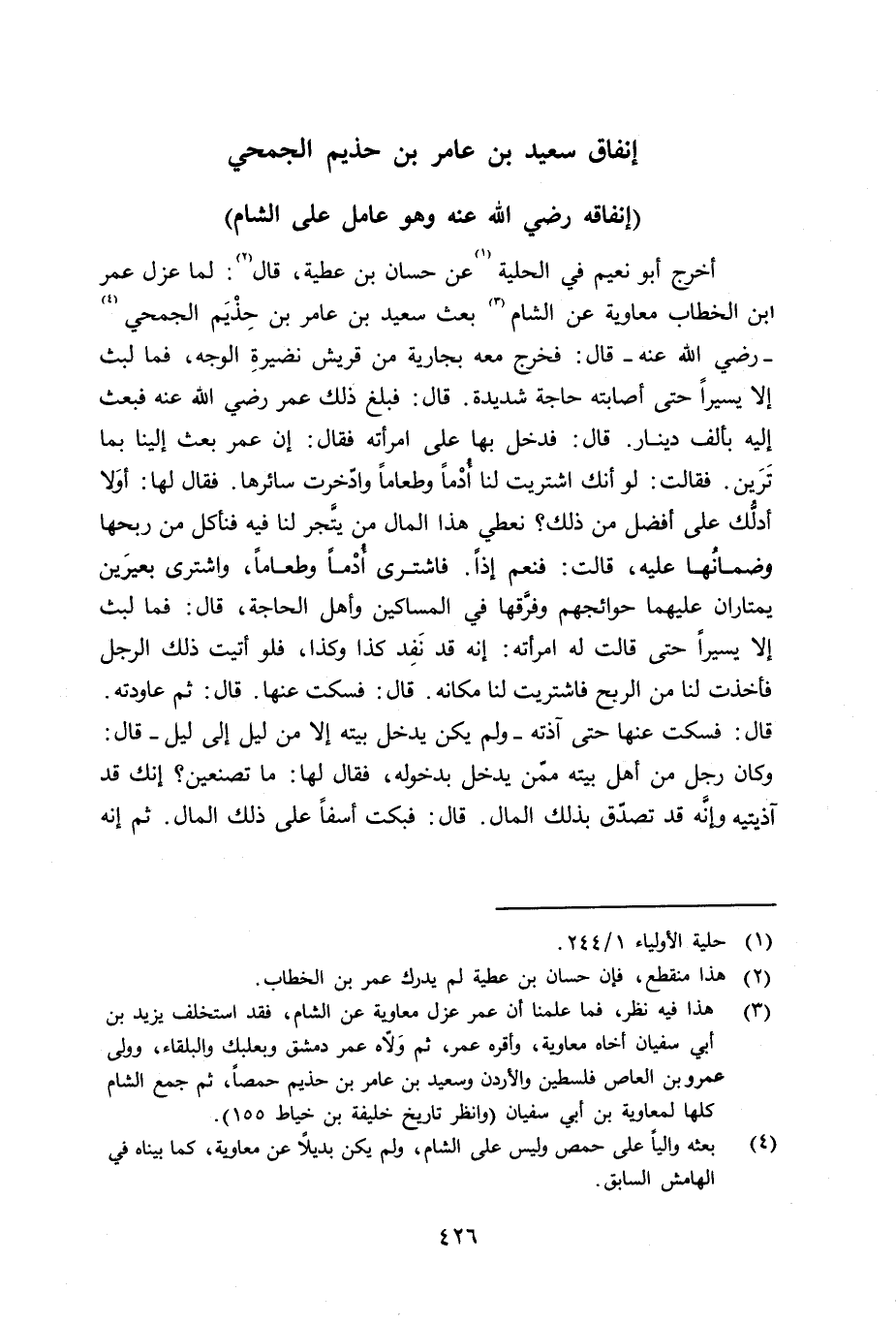 أخرج أبو نعيم في الحلية عن حسان بن عطية قال: لما عزل عمر بن الخطاب معاوية عن الشام بعث سعيد بن عامر بن حِذْيَم الجمحي - رضي الله عنه - قال: فخرج معه بجارية من قريش نضيرةِ الوجه، فما لبث إلا يسيراً حتى أصابته حاجة شديدة. قال: فبلغ ذلك عمر رضي الله عنه فبعث إليه بألف دينار. قال: فدخل بها على إمرأته فقال: إن عمر بعث إلينا بما ترين. فقالت: لو أنك اشتريت لنا أُدْماً وطعاماً وادّخرت سائرها. فقال لها: أوَلاً أدلُّك على أفضل من ذلك؟ نعطي هذا المال من يتَّجر لنا فيه فنأكل من ربحها وضمانُها عليه، قالت: فنعم إذاً. فاشترى أخدْاً طعماً، واشترى بعيرَين وغلامين يمتاران عليهما حوائجهم وفرَّقها في المساكين وأهل الحاجة، قال: فما لبث إلا يسيراً حتى قالت له إمرأته: إنه قد نَفِد كذا وكذا، فلو أتيت ذلك الرجل فأخذت لنا من الربح فاشتريت لنا مكانه. قال: فسكت عنها. قال: ثم عاودته. قال: فسكت عنها حتى آذته - ولم يكن يدخل بيته إلا من ليل إلى ليل - قال: وكان رجل من أهل بيته ممّن يدخل بدخوله، فقال لها: ما تصنعين؟ إنك قد آذيتيه وإنَّه قد تصدّق بذلك المال. قال: فبكت أسفاً على ذلك المال. ثم إنه