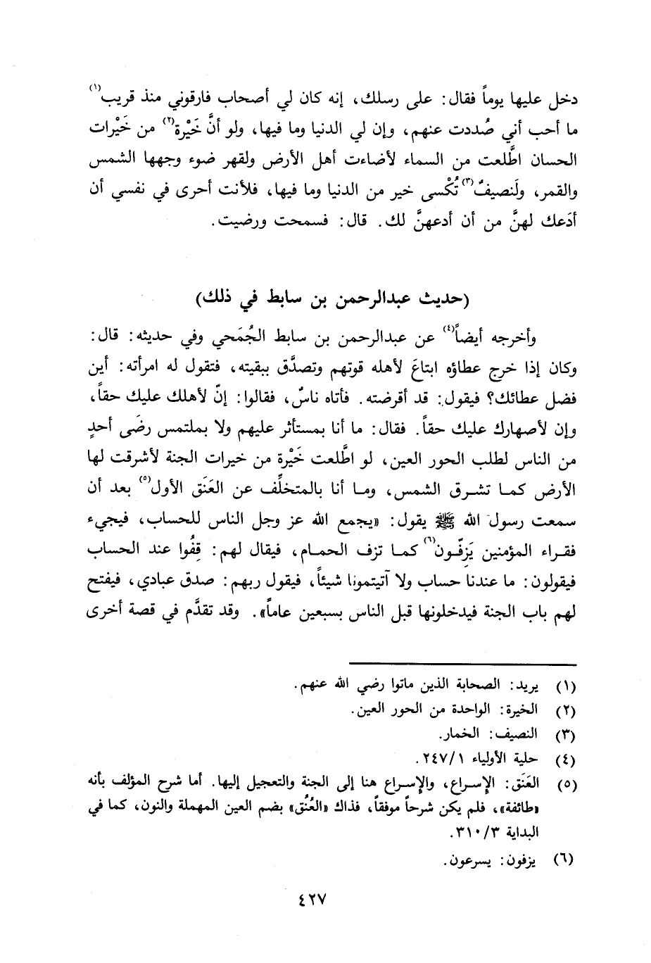 وأخرجه أيضاً عن عبد الرحمن بن سابط الجُمَحي وفي حديثه: قال: وكان إِذا خرج عطاؤه إبتاع لأهله قوتهم وتصدَّق ببقيته، فتقول له إمرأته: أين فضل عطائك؟ فيقول: قد أقرضته. فأتاه ناس فقالوا: إنّ لأهلك عليك حقاً، وإن لأظهارك عليك حقاً. فقال: ما أنا بمستأثر عليهم ولا بملتمس رضى أحد من الناس لطلب الحور العين، لو اطَّلعت خَيْرة من خيرات الجنة لأشرقت لها الأرض كما تشرق الشمس، وما أنا بالتخلِّف عن العَنَق الأول بعد أن سمعت رسول الله صلى الله عليه وسلم يقول: «يجمع الله عزّ وجلّ الناس للحساب، فيجيء فقراء المؤمنين يَزفّون كما تزف الحمام، فيقال لهم: قِفُوا عند الحساب، فيقولون: ما عندنا حساب ولا آتيتمونا شيئاً، فيقول ربهم: صدق عبادي، فيفتح لهم باب الجنة فيدخلونها قبل الناس بسبعين عاماً» . وقد تقدَّم في قصة أخرى