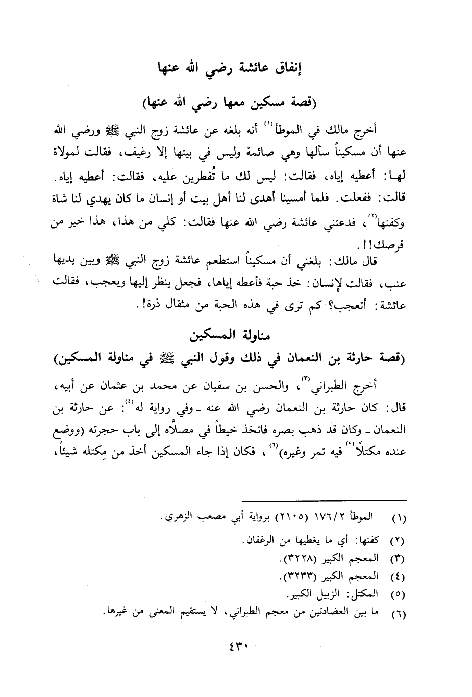 قال مالك: بلغني أن مسكيناً إستطعم عائشة زوج النبي صلى الله عليه وسلم وبين يديه عنب، فقالت لإنسان: خذ حبة فأعطه إياها، فجعل ينظر إليه ويعجب، فقالت عائشة: أتعجب كم ترى في هذه الحبة من مثقال ذرة.