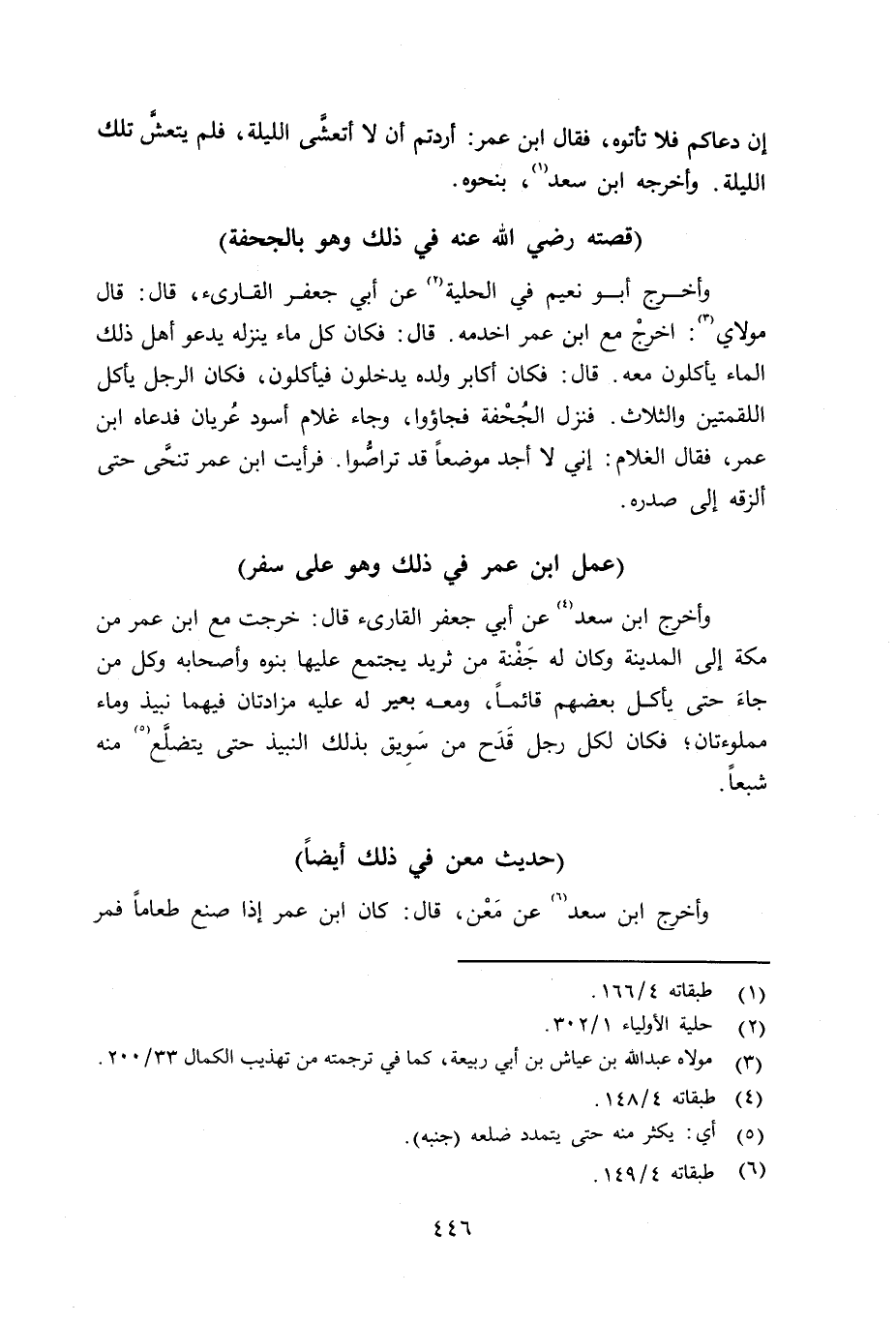 وأخرج أبو نعيم في الحلية عن أبي جعفر القارىء قال: قال مولاي: أخرجُ مع ابن عمر أخدمه. قال: فكان كل ماء ينزله يدعو أهل ذلك الماء يأكلون معه. قال: فكان أكابر ولده يدخلون فيأكلون، فكان الرجل يأكل اللقمتين والثلاث. فنزل الجُحْفة فجاؤوا. وجاء غلام أسود عُريان فدعاه ابن عمر، فقال الغلام: إني لا أجد موضعاً قد تراصُّوا. فرأيت ابن عمر تنحَّى حتى ألزقه إلى صدره.