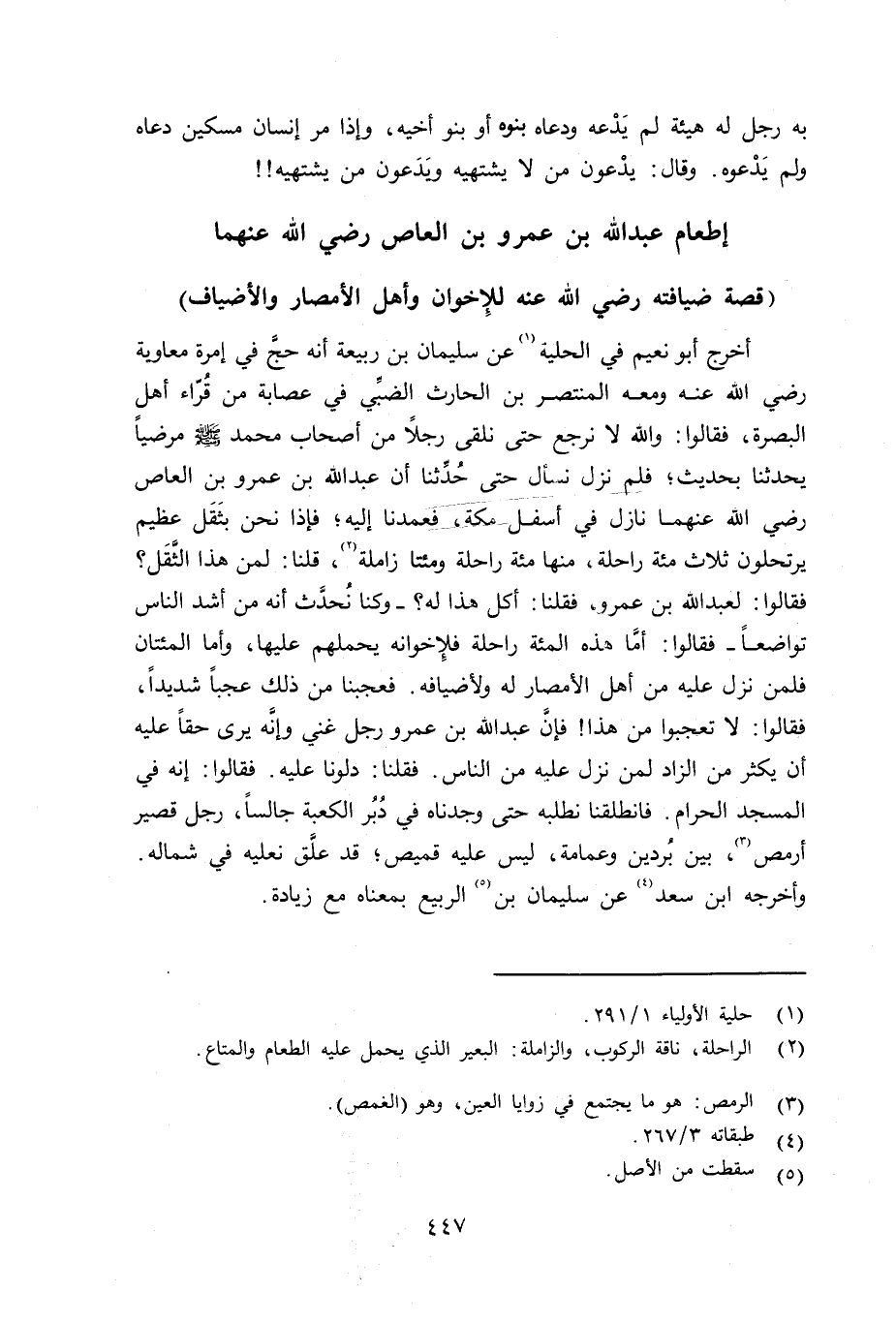 أخرج أبو نعيم في الحلية عن سليمان بن ربيعة أنه حجَّ في إمرة معاوية رضي الله عنه ومعه المنتصر بن الحارث الضبِّي في عصابة من قرّاء أهل البصرة، فقالوا: والله لا نرجع حتى نلقى رجلاً من أصحاب محمد صلى الله عليه وسلم مرضياً يحدثنا بحديث؛ فلم نزل نسأل حتى حُدِّثنا أن عبد الله بن عمرو بن العاص رضي الله عنهما نازل في أسفل مكة، فعمدنا إليه؛ فإذا نحن بثَقَل عظيم يرتحلون ثلاث مائة راحلة، منها مائة راحلة ومائتا زاملة، قلنا: لمن هذا الثَّقَل؟ فقالوا: لعبد الله بن عمرو، فقلنا: أكل هذا له؟ - وكنا نُحدَّث أنه من أشد الناس تواضعاً - فقالوا: أمَّا هذه المائة راحلة فلإِخوانه يحملهم عليها، وأما المائتان فلمن نزل عليه من أهل الأمصار له ولأضيافه. فعجبنا من ذلك عجباً شديداً، فقالوا: لا تعجبوا من هذا فإنَّ عبد الله بن عمرو رجل غني وإنَّه يرى حقاً عليه أن يكثر من الزاد لمن نزل عليه من الناس. فقلنا: دلونا عليه فقالوا: إِنه في المسجد الحرام. فانطلقنا نطلبه حتى وجدناه في دُبُر الكعبة جالساً، رجل قصير أرمص، بين بُردين وعمامة، ليس عليه قميص؛ قد علَّق نعليه في شماله. وأخرجه ابن سعد عن سليمان (بن) الربيع بمعناه مع زيادة.