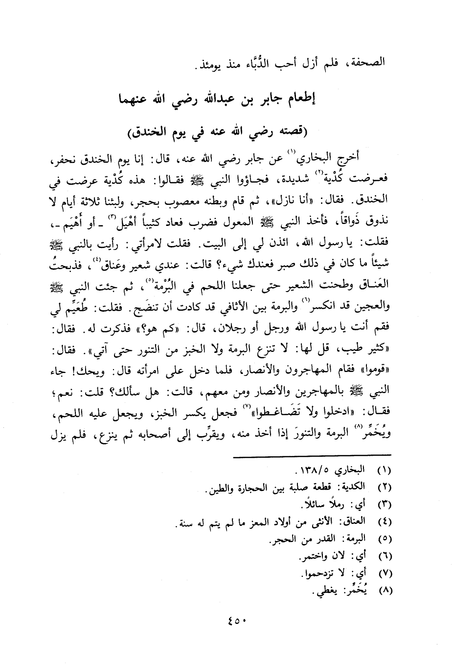 أخرج البخاري عن جابر رضي الله عنه قال: إنا يوم الخندق نحفر، فعرضت كُدْية شديدة، فجاؤوا النبي صلى الله عليه وسلم فقالوا: هذه كُدْية عرضت في الخندق. فقال: «أنا نازل» ، ثم قام وبطنه معصوب بحجر، ولبثنا ثلاثة أيام لا نذوق ذَواقاً، فأخذ النبي صلى الله عليه وسلم المعول فضرب فعاد كثيباً أهْيَل - أو أُهْيَم -، فقلت: يا رسول الله، إئذن لي إلى البيت. فقلت لامرأتي: رأيت بالنبي صلى الله عليه وسلم شيئاً ما كان في ذلك صبر فعندك شيء؟ قالت: عندي شعير عَنق، فذبحتُ العَناق وطحنت الشعير حتى جعلنا اللحم في البُرْمة، ثم جئت النبي صلى الله عليه وسلم والعجين قد انكسر والبرمة بين الأثافي قد كادت أن تنضَج. فقلت: طُعَيِّم لي فقم أنت يا رسول الله ورجل أو رجلان، قال: «كم هو؟» فذكرت له. فقال: «كثير طيب، قل لها: لا تنزع البرمة ولا الخبز من التنور حتى آتي» . فقال: «قوموا» فقام المهاجرون والأنصار، فلما دخل على إمرأته قال: ويحك جاء النبي صلى الله عليه وسلم بالمهاجرين والأنصار ومن معهم، قالت: هل سألك؟ قلت: نعم، فقال: «أدخلوا ولا تَضَاغطوا» فجعل يكسر الخبز، ويجعل عليه اللحم، ويُخَمِّر البرمة والتنورَ إذا أخذ منه، ويقرِّب إلى أصحابه ثم ينزع، فلم يزل