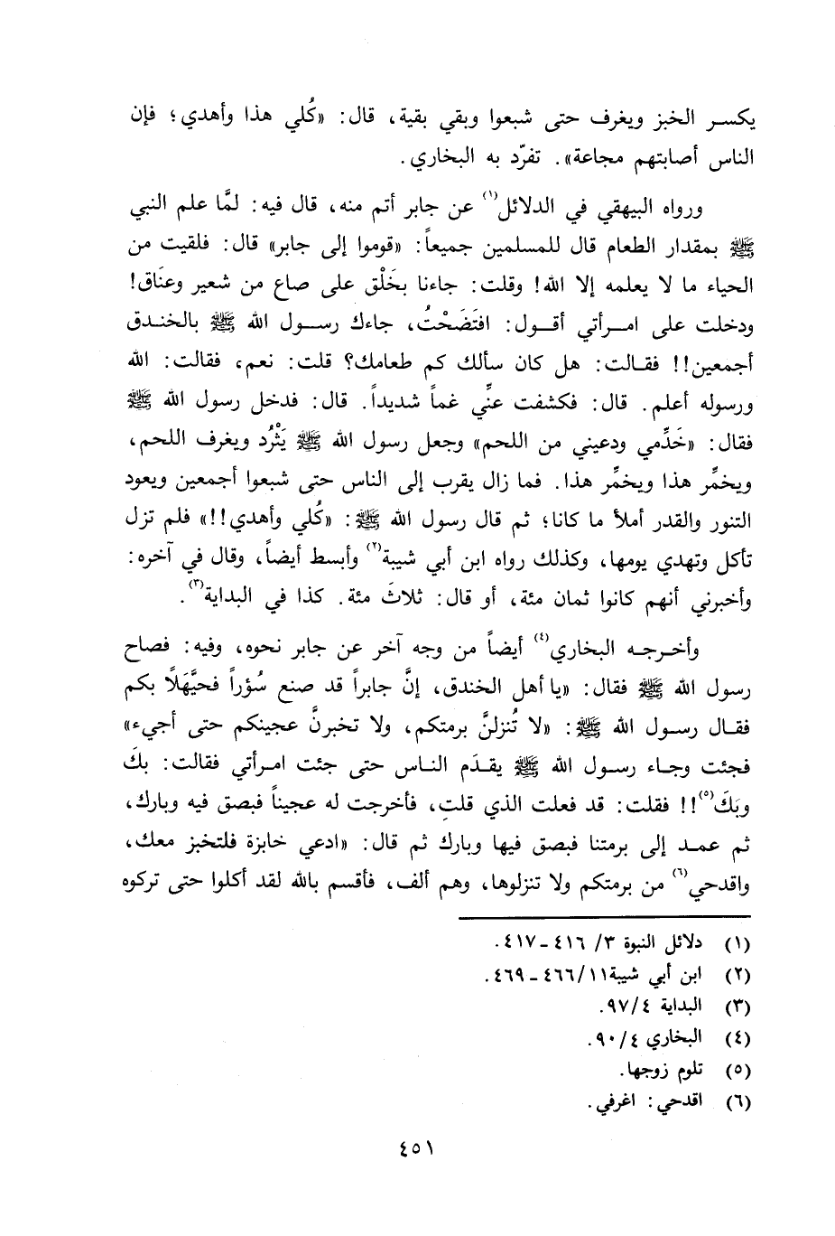 ورواه البيهقي في الدلائل عن جابر أتم منه، قال فيه: لمَّا علم النبي صلى الله عليه وسلم بمقدار الطعام قال للمسلمين جميعاً: «قوموا إِلى جابر قال: فلقيت من الحياء ما لا يعلمه إلا الله وقلت: جاءنا بخَلْق على صاع من شعير وعنَاق ودخلت على إمرأتي أقول: إفتَضحْتُ، جاءك رسول الله صلى الله عليه وسلم بالخندق أجمعين فقالت: هل كان سألك كم طعامك؟ قلت: نعم، فقالت: الله ورسوله أعلم. قال: فكشفت عنِّي غماً شديداً. قال: فدخل رسول الله صلى الله عليه وسلم فقال: «خدمي ودعيني من اللحم» وجعل رسول الله صلى الله عليه وسلم يَثْرُد ويغرف اللحم، ويخمِّر هذا ويخمِّر هذا. فما زال يقرب إلى الناس حتى شبعوا أجمعين ويعود التنور والقدر أملأ ما كانا؛ ثم قال رسول الله صلى الله عليه وسلم «كُلي وأهدي» فلم تزل تأكل وتهدي يومها، وكذلك رواه ابن أبي شيبة وأبسط أيضاً، وقال في آخره: وأخبرني أنهم كانوا ثمان مائة، أو قال: ثلاثَ مائة. كذا في البداية.