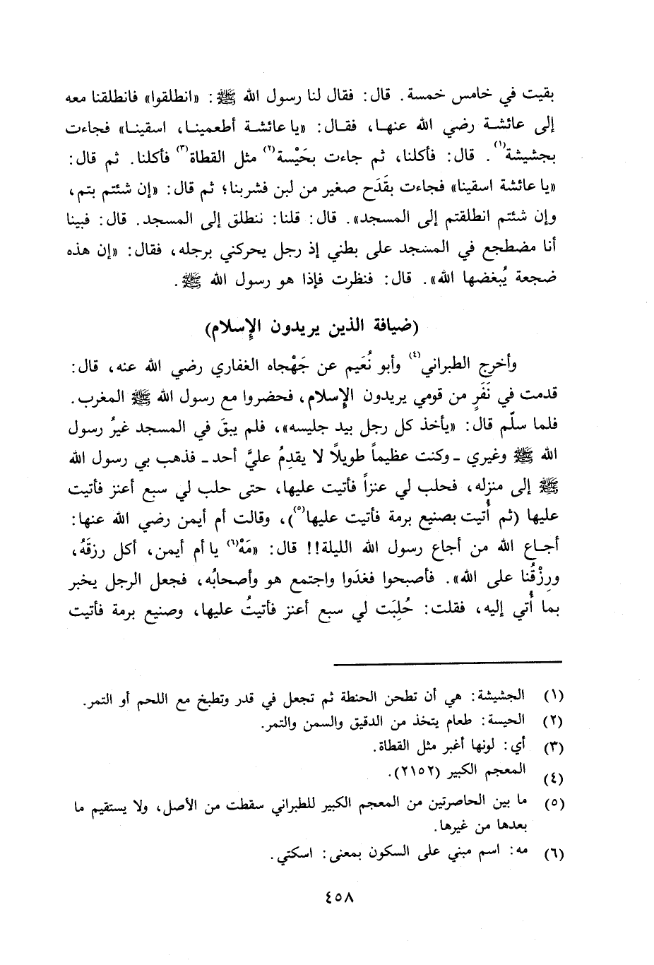 وأخرج الطبراني وأبو نُعَيم عن جَهْجاه الغفاري رضي الله عنه قال: قدمت في نفر من قومي يريدون الإِسلام، فحضروا مع رسول الله صلى الله عليه وسلم فلما سلّم قال: «يأخذ كل رجل بيد جليسه» ، فلم يبقَ في المسجد غيرُ رسول الله صلى الله عليه وسلم وغيري - وكنت عظيماً طويلاً لا يقدِمُ عليَّ أحد - فذهب بي رسول الله صلى الله عليه وسلم إلى منزله، فحلب لي عنزاً فأتيت عليها (ثم بصنيع برمة فأتيت عليه) ، حتى حلب لي سبع أعنز فأتيت عليها، وقالت أم أيمن رضي الله عنها: أجاع الله من أجاع رسول الله الليلة قال: «مَهْ يا أم أيمن، أكل رزقه ورزقنا على الله» فأصبحوا فغدَوا واجتمع هو وأصحابه، فجعل الرجل يخبر بما أُتي إليه، فقلت: حُلبت لي سبع أعنز فأتيت عليها، وصنيع برمة فأتيت