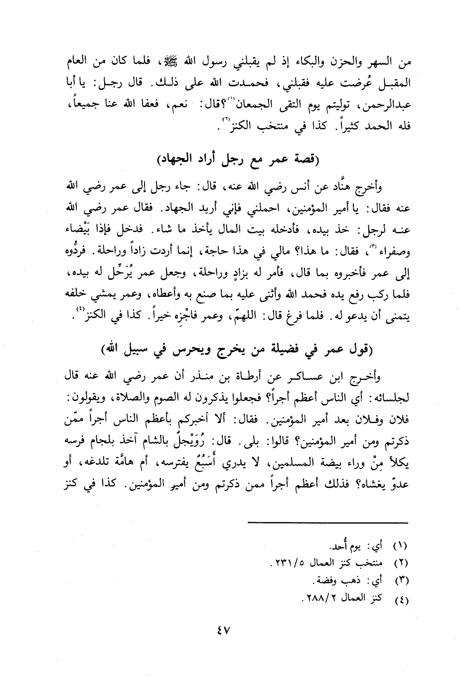وأخرج هنَّاد عن أنس رضي الله عنه قال: جاء رجل إلى عمر رضي الله عنه فقال: يا أمير المؤمين، إحملني فإني أريد الجهاد، فقال عمر رضي الله عنه لرجل: خذ بيده، فأدخله بيت المال يأخذ ما شاء. فدخل فإذا بيضاء وصفراء، فقال: ما هذا؟ ما لي في هذا حاجة، إِما أردت زاداً وراحلة. فردّوه إلى عمر فأخبروه بما قال، فأمر له بزادٍ وراحلة، وجعل عمر يُرَحِّل له بيده، فلما ركب رفع يده فحمد الله وأثنى عليه بما صنع به وأعطاه، ومر يمشي خلفه يتمنى أن يدعو له. فلما فرغ قال: اللهمّ، وعمر فأجْزِه خيراً كذا في الكنز.