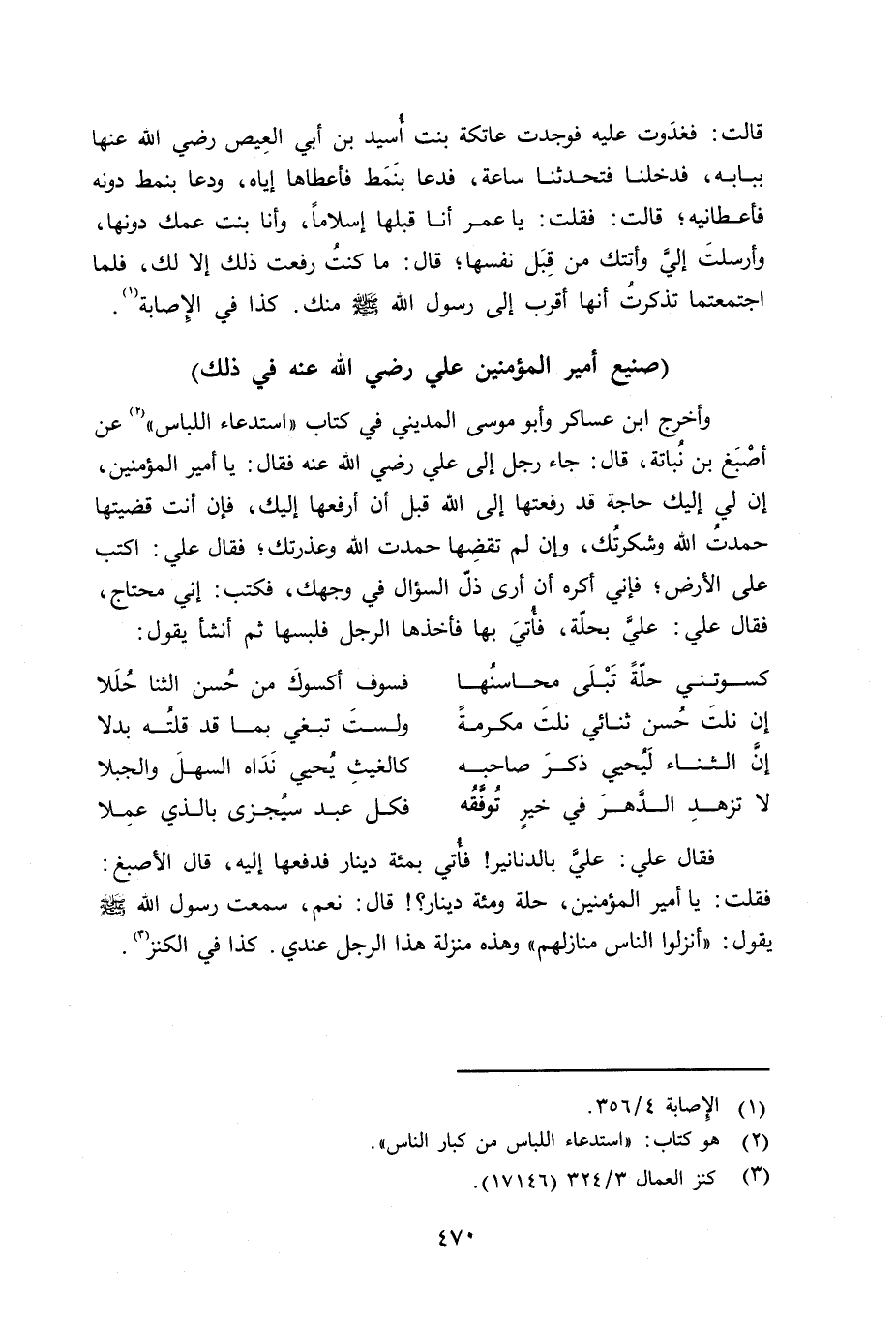 وأخرج ابن عساكر، وأبو موسى المديني في كتاب إستدعاء اللباس عن أصْبَغ بن نُباتة قال: جاء رجل إلى علي رضي الله عنه فقال: يا أمير المؤمنين، إن لي إليك حاجة قد رفعتها إلى الله قبل أن أرفعها إليك، فإن أنت قضيتها حمدتُ الله وشكرتُك، وإن لم تقضِها حمدت الله عذرتك؛ فقال علي: أكتب على الأرض؛ فإني أكره أن أرى ذلّ السؤال في وجهك، فكتب: إني محتاج، فقال علي: عليَّ بحلّة، فأُتيَ بها فأخذها الرجل فلبسها ثم أنشأ يقول: