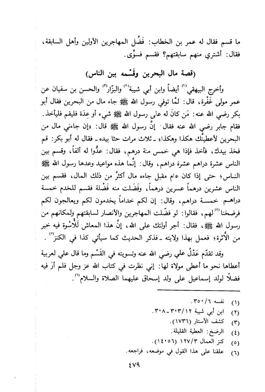 وأخرج البيهقي أيضاً وابن أبي شيبة، والبزّار، الحسن بن سفيان عن عمر مولى غَفْرة قال: لمَّا توفي رسول الله صلى الله عليه وسلم جاء مال من البحرين فقال أبو بكر رضي الله عنه: من كان له على رسول الله صلى الله عليه وسلم شيء أو عِدَة فليقم فليأخذ. فقام جابر رضي الله عنه فقال: إنَّ رسول الله صلى الله عليه وسلم قال: «إن جاءني مال من البحرين لأعطينَّك هكذا وهكذا» - ثلاث مرات حثا بيده - فقال له أبو بكر: قم فخذ بيدك، فأخذ فإذا هي خمس مائة درهم، فقال: عدُّوا له ألفاً، وقسم بين الناس عشرة دراهم عشرة دراهم، وقال: إنَّما هذه مواعيد وعدها رسول الله صلى الله عليه وسلم الناس؛ حتى إذا كان عام مقبل جاءه مال أكثرُ من ذلك المال، فقسم بين الناس عشرين درهماً عشرين درهماً، وفَضَلت منه فَضْلة فقسم للخدم خمسة دراهم خمسة دراهم، وقال: إن لكم خداماً يخدمون لكم ويعالجون لكم فرضخنا لهم، فقالوا: لو فضّلت المهاجرين والأنصار لسابقتهم ولمكانهم من رسول الله صلى الله عليه وسلم فقال: أجر أولئك على الله، إنَّ هذا العاش لَلأُسْوة فيه خير من الأَثرة؛ فعمل بهذا ولايته - فذكر الحديث كما سيأتي كذا في الكنز.