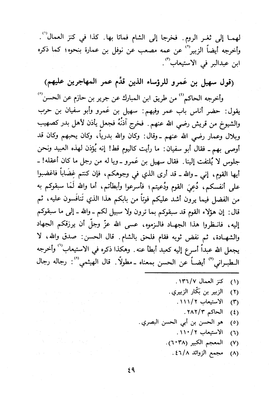 وأخرجه الحاكم من طريق ابن المبارك عن جرير بن حازم عن الحسن يقول: حضر أناس باب عمر وفيهم: سهيل بن عمرو، وأبو سفيان بن حرب، والشيوخ من قريش رضي الله عنهم. فخرج آذنه فجعل يأذن لأهل بدر كصهيب، وبلال، وعمار رضي الله عنهم - وقال: وكان والله بدرياً، وكان يحبهم وكان قد أوصى بهم - فقال أبو سفيان: ما رأيت كاليوم قط إنه يأذن لهذه العبيد ونحن جلوس لا يلتفت إلينا. فقال سهيل بن عمرو - ويا له من رجل ما كان أعقله - أيها القوم، إِني - والله - قد أرى الذي في وجوهكم، فإن كنتم غضاباً فاغضبوا على أنفسكم، دُعِيَ القوم ودُعيتم؛ فأسرعوا وأبطأتم، أما والله لَمَا سبقوكم به من الفضل فيما يرون أشد عليكم فوتاً من بابكم هذا الذي تَنافَسون عليه، ثم قال: إن هؤلاء القوم قد سبقوكم بما ترون ولا سبيل لكم - والله - إلى ما سبقوكم إليه، فانظروا هذا الجهاد فالزموه، عسى الله عزّ وجلّ أن يرزقكم الجهاد والشهادة، ثم نفض ثوبه فقام فلحق بالشام. قال الحسن: صدق والله، لا يجعل الله عبداً أسرع إليه معبد أبطأ عنه. وهكذا ذكره في الإستيعاب وأخرجه الطبراني أيضاً عن الحسن بمعناه - مطولاً. قال الهيثمي رجاله رجال