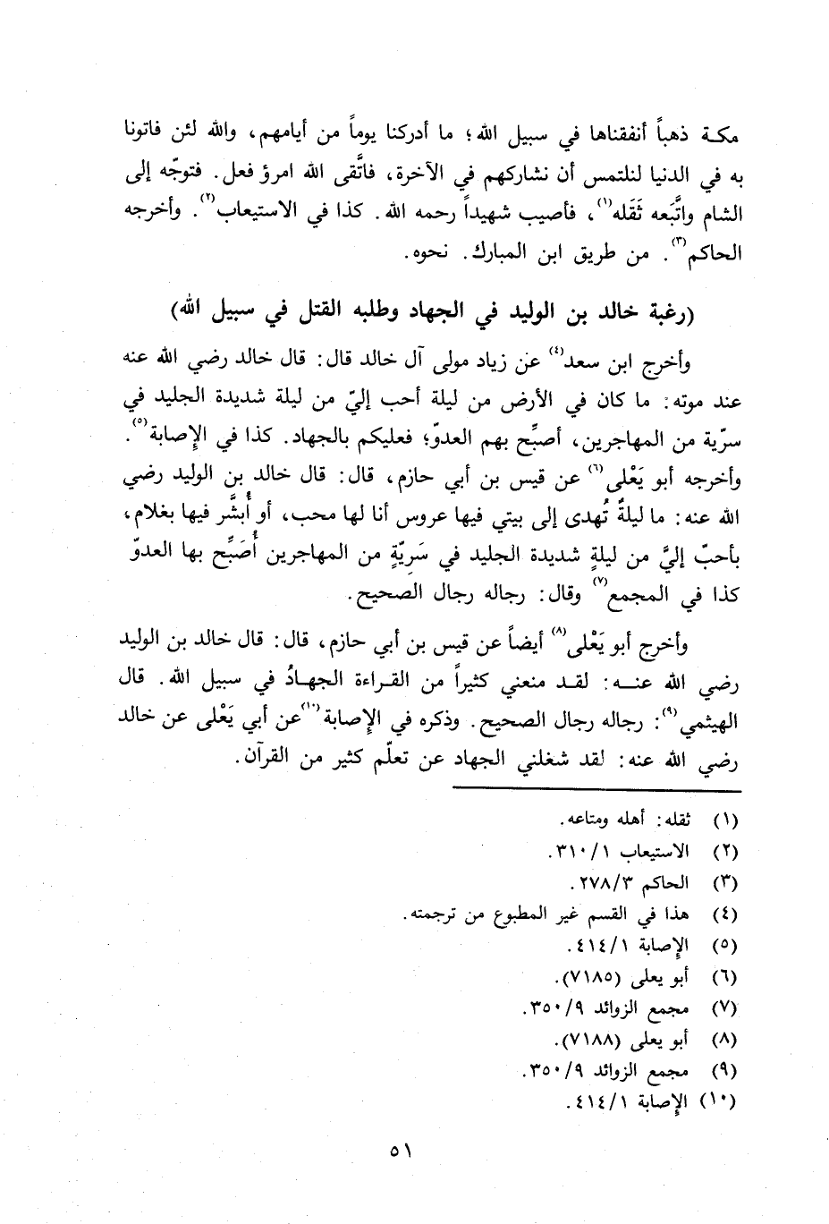 وأخرج أبو يَعْلى أيضاً عن قيس بن أبي حازم قال: قال خالد بن الوليد رضي الله عنه: لقد منعني كثيراً من القراءة الجهادُ في سبيل الله. قال الهيثمي: رجاله رجال الصحيح. وذكره في الإِصابة عن أبي يَعْلى عن خالد رضي الله عنه: لقد شغلني الجهاد عن تعلّم كثير من القرآن.