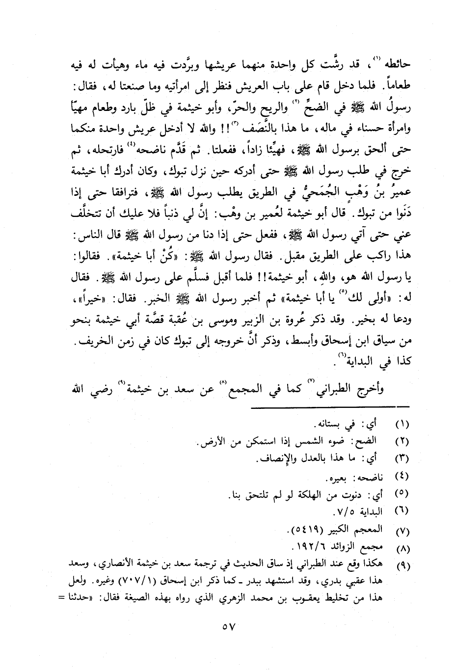 حائطه، قد رشَّت كل واحدة منها عريشها وبرَّدت (له) فيه ماء وهيأت له فيه طعاماً. فلما دخل قام على باب العريش فنظر إلى إمرأتيه وما صنعتا له. فقال: رسول الله صلى الله عليه وسلم في الضحِّ والريح والحرّ، وأبو خيثمة في ظلّ بارد وطعام مهيّأ وامرأة حسناء (مقيم) في ماله، ما هذا بالنَّصَف (ثم قال) الله، لا أدخل عريش وحدة منكما حتى ألحق برسول الله صلى الله عليه وسلم فهيِّئا (لي) زاداً، ففعلتا. ثم قدّم ناضحه فارتحله، ثم خرج في طلب رسول الله صلى الله عليه وسلم حتى أدركه حين نزل تبوك، وقد كان أدرك أبا خيثمة عميرُ بن وهْب الجمحي في الطريق يطلب رسول الله صلى الله عليه وسلم فترافقا حتى إذا دَنَا من تبوك. قال أبو خيثمة لعُمير بن وهْب: إنَّ لي ذنباً فلا عليك أن تتخلَّف عني حتى آتي رسول الله صلى الله عليه وسلم ففعل حتى إذا دنا من رسول الله صلى الله عليه وسلم (وهو نازل بتبوك) قال الناس: هذا راكب على الطريق مقبل. فقال رسول الله صلى الله عليه وسلم «كُنْ أبا خيثمة» . فقالوا: يا رسول الله هو - والله - أبو خيثمة فلما أناخ) أقبل فسلَّم على رسول الله صلى الله عليه وسلم فقال له: (رسول الله صلى الله عليه وسلم: «أولى لك يا أبا خيثمة» : خيراً، ودعا له بخير. وقد ذكر عُروة بن الزبير، وموسى بن عُقبة بن قصَّة أبي خيثمة بنحو من سياق ابن إسحاق وأبسط، وذكر أن خروجه إلى تبوك كان في زمن الخريف. كذا في البداية.