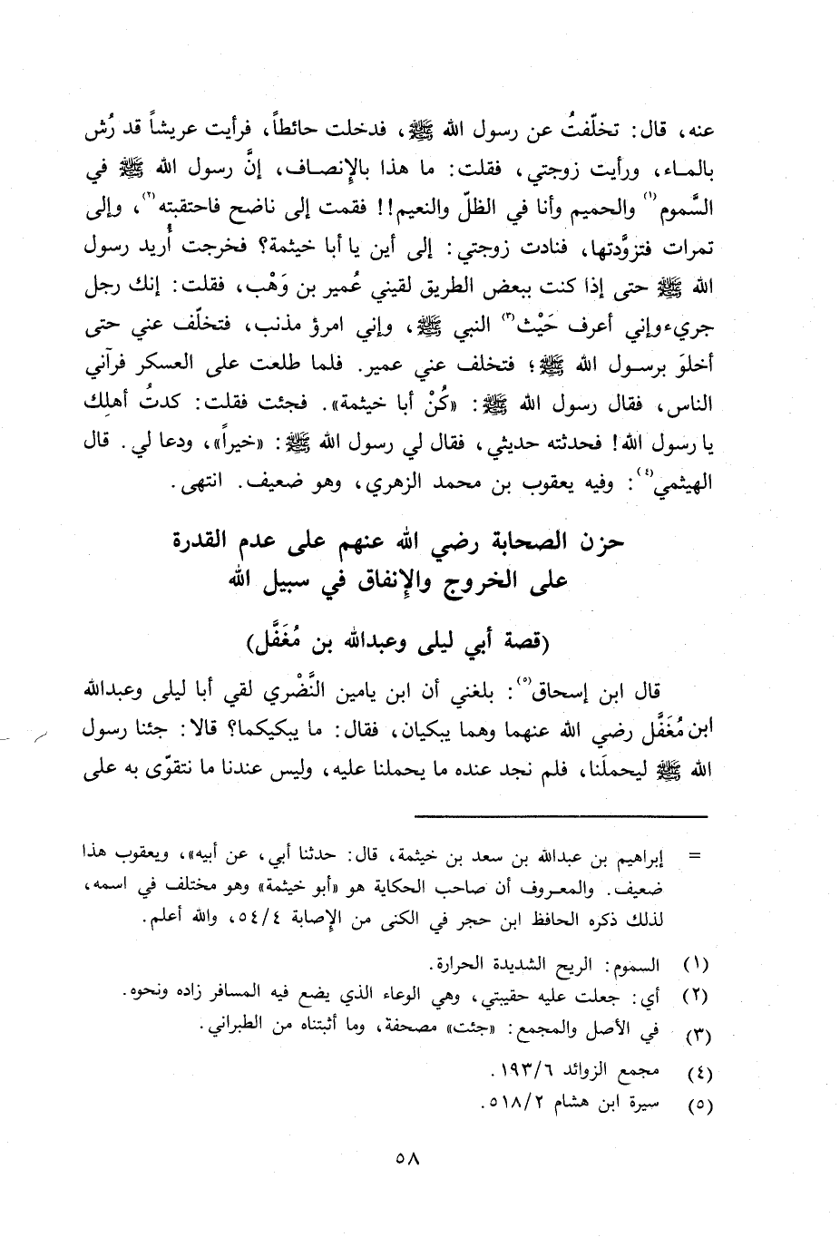 عنه قال: تخلّفت عن رسول الله صلى الله عليه وسلم فدخلت حائطاً، فرأيت عريشاً قد رُش بالماء، ورأيت زوجتي، فقلت: ما هذا بالإِنصاف، إنَّ رسول الله صلى الله عليه وسلم في السَّموم والحميم وأنا في الظلّ والنعيم فقمت إلى ناضح فاحتقبته، وإِلى تمرات فتزوَّدتها، فنادت زوجتي: إلى أين يا أبا خيثمة؟ فخرجت أُريد رسول الله صلى الله عليه وسلم حتى إذا كنت ببعض الطريق لقيني عُمير بن وهب، فقلت: إنك رجل جريء وإني أعرف جئت رضي الله عنه، وإني أمرؤ مذنب، فتخلّف عني حتى أخلوَ برسول الله صلى الله عليه وسلم فتخلف عني عمير. فلما طلعت على العسكر فرآني الناس، فقال رسول الله صلى الله عليه وسلم «كُنْ أبا خيثمة» .d فجئت فقلت: كدتُ أهلِك يا رسول الله فحدثته حديثي. فقال لي رسول الله صلى الله عليه وسلم خيراً، ودعا لي. قال الهيثمي: وفيه يعقوب بن محمد الزهري، وهو ضعيف. انتهى.
