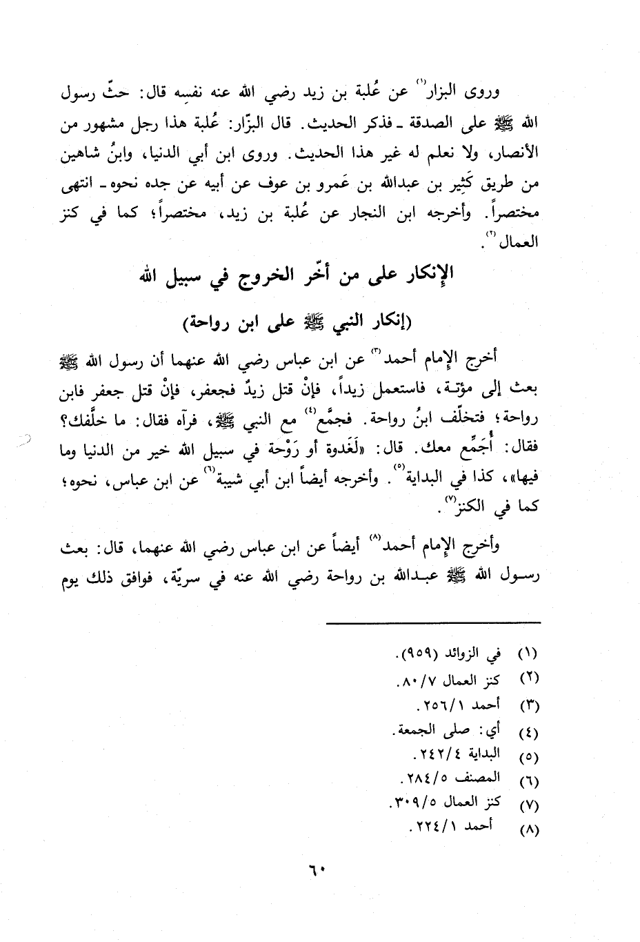 أخرج الإِمام أحمد عن ابن عباس رضي الله عنهما أن رسول الله صلى الله عليه وسلم بعث إلى مؤتة، فاستعمل زيداً، فإنْ قتل زيد فجعفر، فإنْ قتل جعفر فابن رواحة؛ فتخلّف ابن رواحة. فجمَّع مع النبي صلى الله عليه وسلم فرآه فقال: ما خلَّفك؟ فقال: أجمِّع معك. قال: لَغَدوة أو رَوْحة في سبيل الله خير من الدنيا وما فيها» - كذا في البداية. وأخرجه أيضاً ابن أبي شيبة عن ابن عباس - نحوه؛ كما في الكنز.