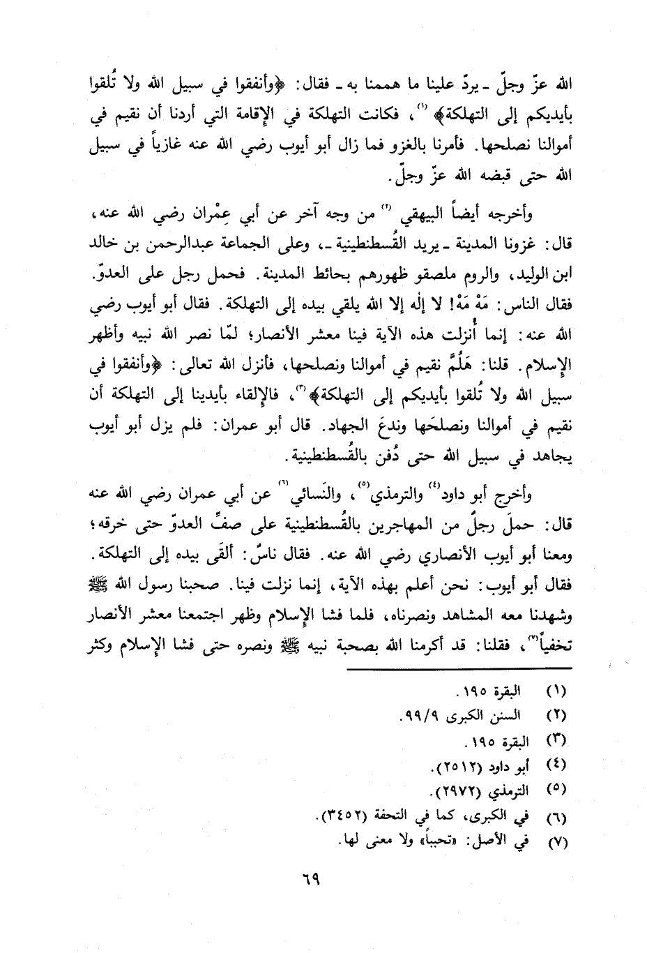 وأخرجه أيضاً البيهقي من وجه آخر عن أبي عمران رضي الله عنه قال: غزونا المدينة - يريد القُسطنطينية -، وعلى الجماعة عبد الرحمن بن خالد بن الوليد، والروم ملصقو ظهورهم بحائط المدينة. فحمل رجل على العدوّ. فقال الناس: مَهْ مَهْ لا إله إلا الله يلقي بيده إلى لتهلكة. فقال أبو أيوب رضي الله عنه: إنما أُنزلت هذه الآية فينا معشر الأنصار؛ لمّا نصر الله نبيه وأظهر الإِسلام. قلنا: هَلُمَّ نقيم في أموالنا ونصلحها. فأنزل الله تعالى: {وَأَنفِقُواْ فِى سَبِيلِ اللَّهِ وَلاَ تُلْقُواْ بِأَيْدِيكُمْ إِلَى التَّهْلُكَةِ} ، فالإِلقاء بأيدينا إلى التهلكة أن نقيم في أموالنا ونصلحَها وندعَ الجهاد. قال أبو عمران: فلم يزل أبو أيوب يجاهد في سبيل الله حتى دفن بالقُسطنطينية.