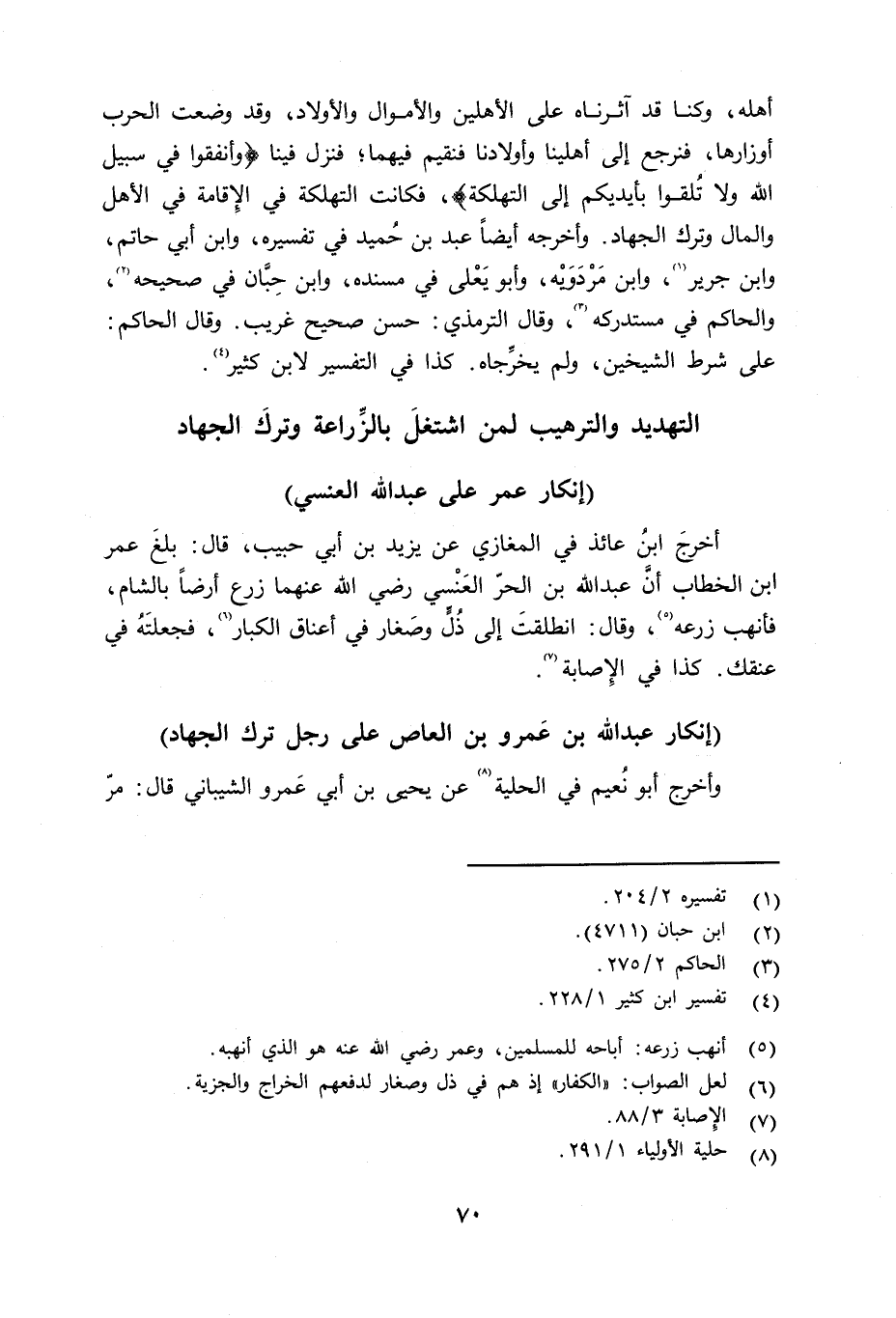 أهله، وكنا قد آثرناه على الأهلين والأموال والأولاد، وقد وضعت الحرب أوزارها، فنرجع إلى أهلينا وأولادنا فنقيم فيهما؛ فنزل فينا {وَأَنفِقُواْ فِى سَبِيلِ اللَّهِ وَلاَ تُلْقُواْ بِأَيْدِيكُمْ إِلَى التَّهْلُكَةِ} ، فكانت التهلكة في الإِقامة في الأهل والمال وترك الجهاد. وأخرجه أيضاً عبد بن حُميد في تفسيره، وابن أبي حاتم، وابن جرير، وابن مَرْدَوَيْه، وأبو يَعْلى في مسنده، وابن حِبَّان في صحيحه، والحاكم في مستدركه. وقال الترمذي: حسن صحيح غريب. وقال الحاكم: على شرط الشيخين، ولم يخرِّجاه. كذا في تفسير لابن كثير.