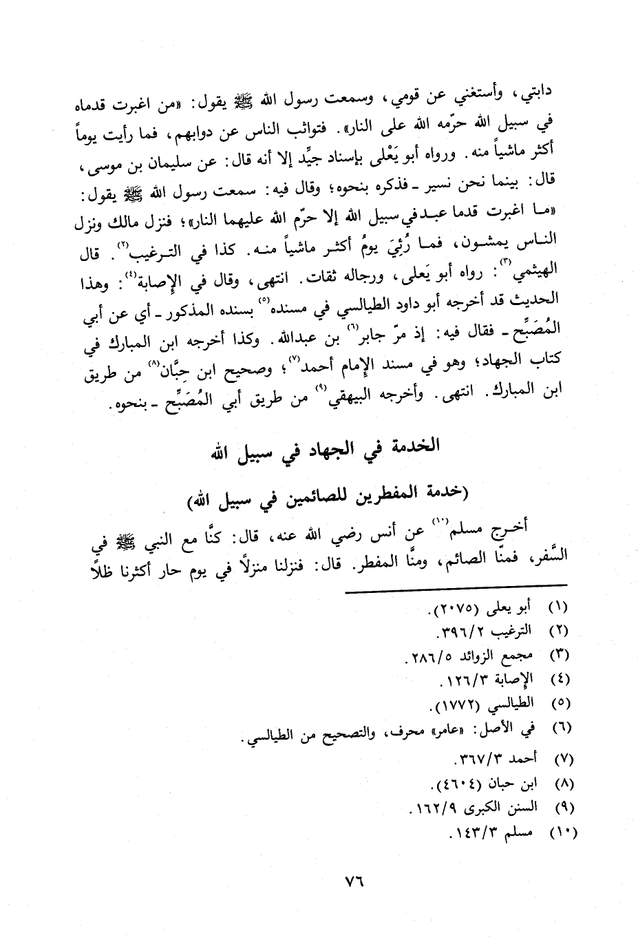دابتي، وأستغني عن قومي، سمعت رسول الله صلى الله عليه وسلم يقول: «من اغبرت قدماه في سبيل الله حرّمه الله على النار. فتواثب الناس عن دوابهم، فما رأيت يوماً أكثر ماشياً منه. ورواه أبو يَعْلى بإسناد جيِّد إلا أنه قال: عن سليمان بن موسى قال: بينما نحن نسير - فذكره بنحوه؛ وقال فيه: سمعت رسول الله صلى الله عليه وسلم يقول: «ما اغبرت قدما عبد في سبيل الله إلا حرّم الله عليهما النار» ؛ فنزل مالك ونزل الناس يمشون، فما رئي يومُ أكثر ماشياً منه. كذا في الترغيب. قال الهيثمي: رواه أبو يَعلى، ورجاله ثقات. انتهى. وقال في الإِصابة: وهذا الحديث قد أخرجه أبو داود الطيالسي في مسنده بسنده المذكور - أي عن أبي المُصَبِّح - فقال فيه: إذ مرّ جابر بن عبد الله. وكذا أخرجه ابن المبارك في كتاب الجهاد؛ وهو في مسند الإِمام أحمد؛ وصحيح ابن حِبَّان من طريق ابن المبارك. انتهى. وأخرجه البيهقي من طريق أبي المُصَبِّح - بنحوه.