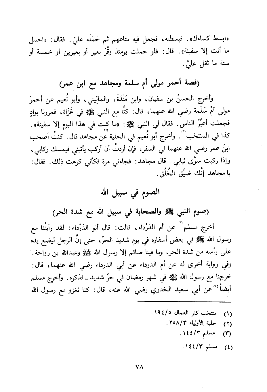 وأخرج الحسن بن سفيان، وابن مَنْدَه، والمالِيني، وأبو نُعيم عن أحمرَ مولى أم سَلَمة رضي الله عنهما قال: كنَّا مع النبي صلى الله عليه وسلم في غَزَاة، فمررنا بوادٍ فجعلت أعبِّرُ الناس. فقال لي النبي صلى الله عليه وسلم «ما كنت في هذا اليوم إلا سفينة» . كذا في المنتخب. وأخرج أبو نُعيم في الحلية عن مجاهد قال: كنت أصحب ابن عمر رضي الله عنهم في السفر، فإن أردت أن أركب يأتيني فيمسك ركابي، وإِذا ركبت سوّى ثيابي. قال مجاهد: فجاءني مرة فكأني كرهت ذلك. فقال: يا مجاهد إنَّك ضيِّق الخُلُق.