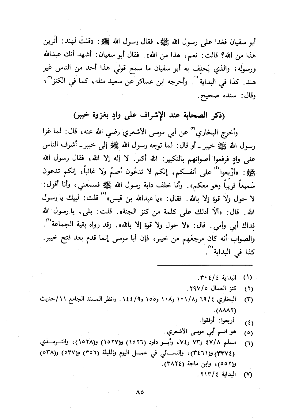 وأخرج البخاري عن أبي موسى الأشعري رضي الله عنه قال: لما غزا رسول الله صلى الله عليه وسلم خيبر - أو قال: لما توجه رسول الله صلى الله عليه وسلم إلى خيبر - أشرف الناس على وادٍ فرفعوا أصواتهم بالتكبير: الله أكبر، لا إله إلا الله، فقال رسول الله صلى الله عليه وسلم «أرْبِعوا على أنفسكم، إنكم لا تدعُون أصمّ ولا غائباً، إنكم تدعون سمعياً قريباً وهو معكم» . وأنا خلف دابة رسول الله صلى الله عليه وسلم فسمعني، وأنا أقول: لا حول ولا قوة إلا بالله: فقال: «يا عبد الله بن قيس» قلت: لبيك يا رسول الله قال: «ألا أدلك على كلمة من كنز الجنة» . قلت: بلى، يا رسول الله فِداك أبي وأمي. قال: «لا حول ولا قوة إلا بالله» . وقد رواه بقية الجماعة. والصواب أنه كان مرجعَهم من خيبر، فإن أبا موسى إنما قدم بعد فتح خيبر. كذا في البداية.