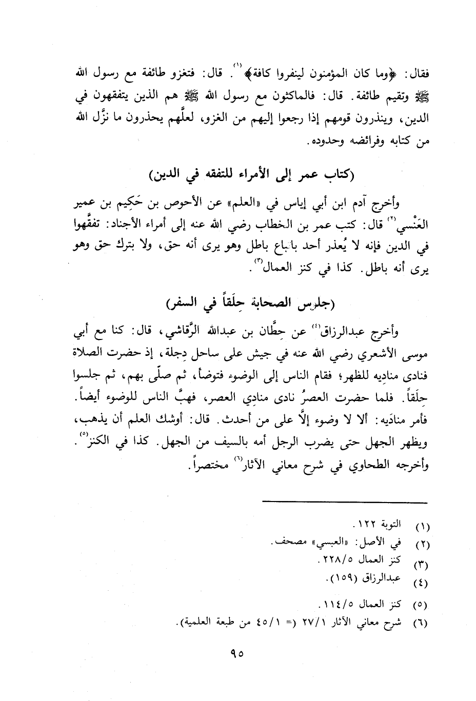 وأخرج آدم بن أبي إياس في «العلم» عن الأحوص بن حكيم بن عمير العبسي قال: كتب عمر بن الخطاب رضي الله عنه إلى أمراء الأجناد: تفقَّهوا في الدين فإنه لا يُعذر أحد باتباع باطل وهو يرى أنه حق، ولا بترك حق وهو يرى أنه باطل. كذا في كنز العمال.