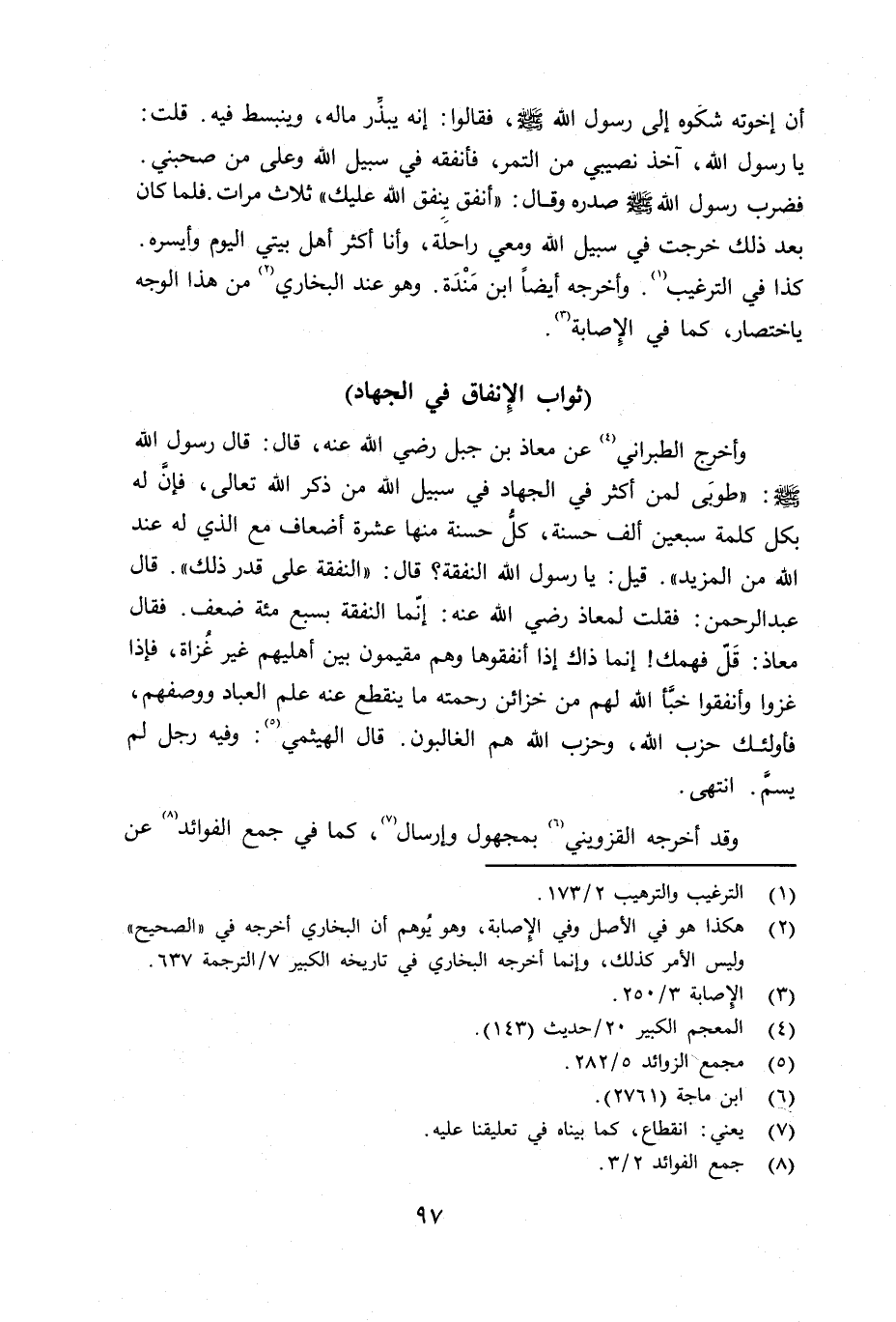 وأخرج الطبراني عن معاذ بن جبل رضي الله عنه قال: قالت: «طوبى لمن أكثر في الجهاد في سبيل الله من ذكر الله تعالى، فإنَّ له بكل كلمة سبعين ألف حسنة، كل حسنة منها عشرة أضعاف مع الذي له عند الله من المزيد» . قيل: يا رسول الله النفقة؟ قال: «النفقة على قدر ذلك» . قال بعد الرحمن: فقلت لمعاذ رضي الله عنه: إنّما النفقة بسبع مائة ضعف. فقال معاذ: قلّ فهمك إنما ذاك إذا أنفقوها وهم مقيمون بين أهليهم غير غُزاة. فإذا غزوا وأنفقوا خبَّأ الله لهم من خزائن رحمته ما ينقطع عنه علم العباد ووصفهم، فأولئك حزب الله، وحزب الله هم الغالبون. قال الهيثمي وفيه رجل لم يسمَّ. انتهى.