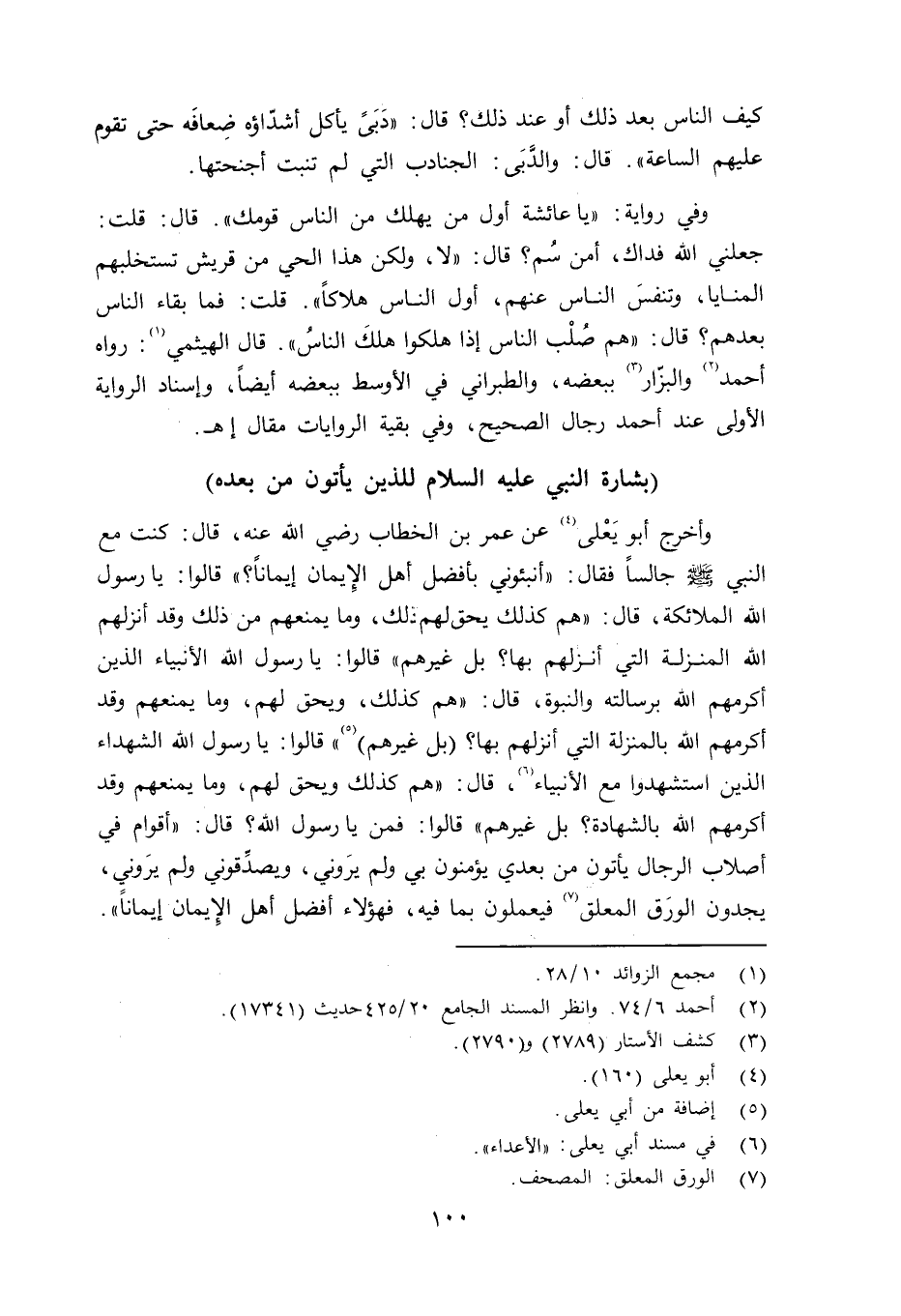 وأخرج أبو يَعْلى عن عمر بن الخطاب رضي الله عنه قال: كنت مع النبي صلى الله عليه وسلم جالساً فقال: «أنبئوني بأفضل أهل الإِيمان إيماناً؟» قالوا: يا رسول الله الملائكة، قال: «هم كذلك يحق لهم ذلك، وما يمنعهم من ذلك وقد أنزلهم الله بها؟» قالوا: يا رسول الله الشهداء الذين استشهدوا مع الأنبياء، قال: «هم كذلك ويحق لهم، وما يمنعهم وقد أكرمهم الله بالشهادة؟ بل غيرهم» قالوا: فمن يا رسول الله؟ قال: «أقوام في أصلاب الرجال يأتون من بعدي يؤمنون بي ولم يروني، ويصدِّقوني ولم يرَوني، يجدون الورَق المعلق فيعملون بما فيه، فهؤلاء أفضل أهل الإيمان إيماناً» .