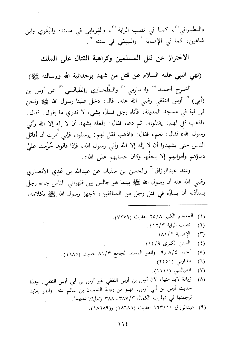نهي النبي عليه السلام عن قتل من شهد بوحدانية الله ورسالته صلى الله عليه وسلم أخرج أحمد والدارمي والطَّحاوي والطَّيالسي عن أوس بن أوس الثقفي رضي الله عنه قال: دخل علينا رسول الله صلى الله عليه وسلم ونحن في قبة في مسجد المدينة، فأتاه رجل فسارَّه بشيء لا ندري ما يقول. فقال: «ذاهب قل لهم: يقتلوه» . ثم دعاه فقال: «لعله يشهد أن لا إله إلا الله وأني رسول الله» فقال: نعم، فقال: «اذهب فقل لهم: يرسلوه، فإني أُمرت أن يقاتل الناس حتى يشهدوا أن لا إله إلا الله وأني رسول الله، فإذا قالوها حُرِّمت عليَّ دماؤهم وأموالهم إلا بحقِّها وكان حسابهم على الله» .