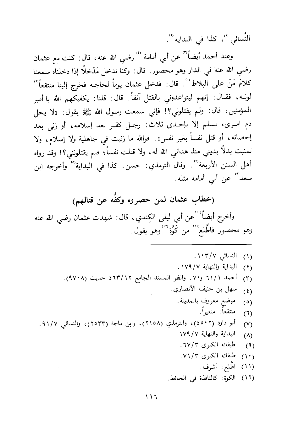وأخرج أيضاً عن أبي ليلى الكندي قال: شهدت عثمان رضي الله عنهوهو محصور فاطَّلع من كَوَّة وهو يقول: