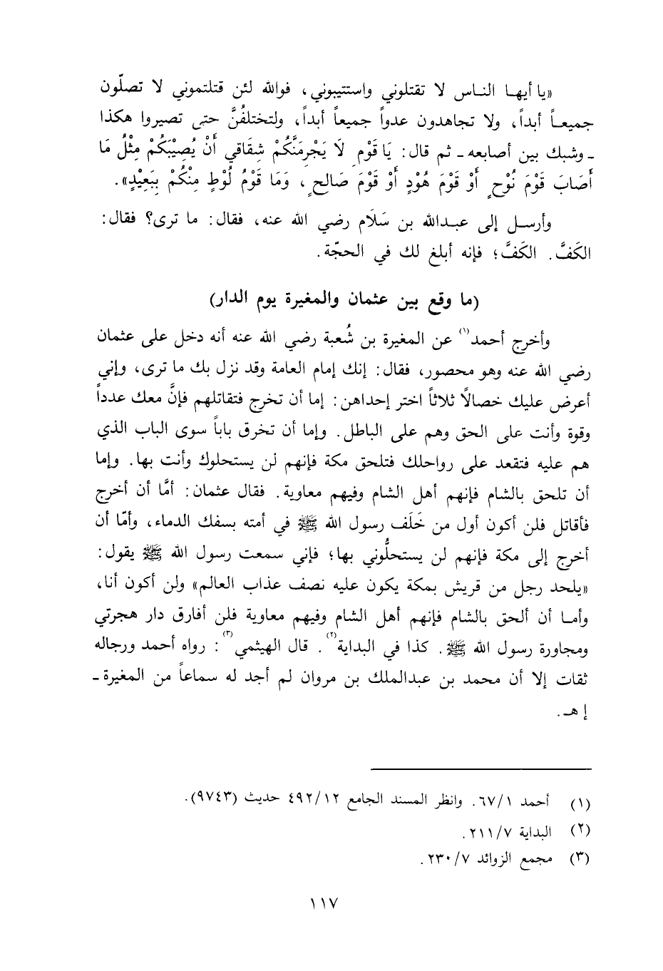 وأخرج أحمد عن المغيرة بن شُعبة رضي الله عنه أنه دخل على عثمان رضي الله عنه وهو محصور، فقال: إنك إمام العامة وقد نزل بك ما ترى، وإني أعرض عليك خصالاً ثلاثاً اختر إحداهن: إما أن تخرج فتقاتلهم فإنَّ معك عدداً وقوة وأنت على الحق وهم على الباطل. وإما أن تخق باباً سوى الباب الذي هم عليه فتقعد على رواحلك فتلحق مكة فإنهن لن يستحلوك وأنت بها. وإما أن تلحق بالشام فإنهم أهل الشام وفيهم معاوية. فقال عثمان: أمَّا أن أخرج فأقاتل فلن أكون أول من خَلَف رسول الله صلى الله عليه وسلم في أمته بسفك الدماء، وأمّا أن أخرج إلى مكة فإنهم لن يستحلُّوني بها؛ فإني سمعت رسول الله صلى الله عليه وسلم يقول: «يلحد رجل من قريش بمكة يكون عليه نصف عذاب العالم» ولن أكون أنا، وأما أن ألحق بالشام فإنهم أهل الشام وفيهم معاوية فلن أفارق دار هجرتي ومجاورة رسول الله صلى الله عليه وسلم كذا في البداية قال الهيثمي:: رواه أحمد ورجاله ثقات إلا أن محمد بن عبد الملك بن مروان لم أجد له سماعاً من المغيرة - اهـ.