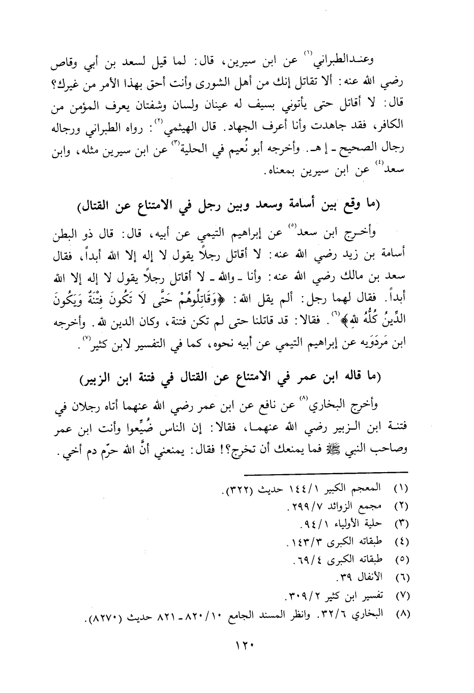 وأخرج ابن سعد عن إبراهيم التيمي عن أبيه قال: قال ذو البطن أسامة بن زيد رضي الله عنه: لا أقاتل رجلاً يقول لا إله إلا الله أبداً، فقال سعد بن مالك رضي الله عنه: وأنا - والله - لا أقاتل رجلاً يقول لا إله إلا الله أبداً. فقال لهما رجل: ألم يقل الله: {وَقَاتِلُوهُمْ حَتَّى لاَ تَكُونَ فِتْنَةٌ وَيَكُونَ الدّينُ كُلُّهُ لِلهِ} (سورة الأنفال، الآية: 39) . فقالا: قد قاتلنا حتى لم تكن فتنة، وكان الدين لله. وأخرجه ابن مَردَوَيه عن إبراهيم التيمي عن أبيه نحوه، كما في التفسير لابن كثير.