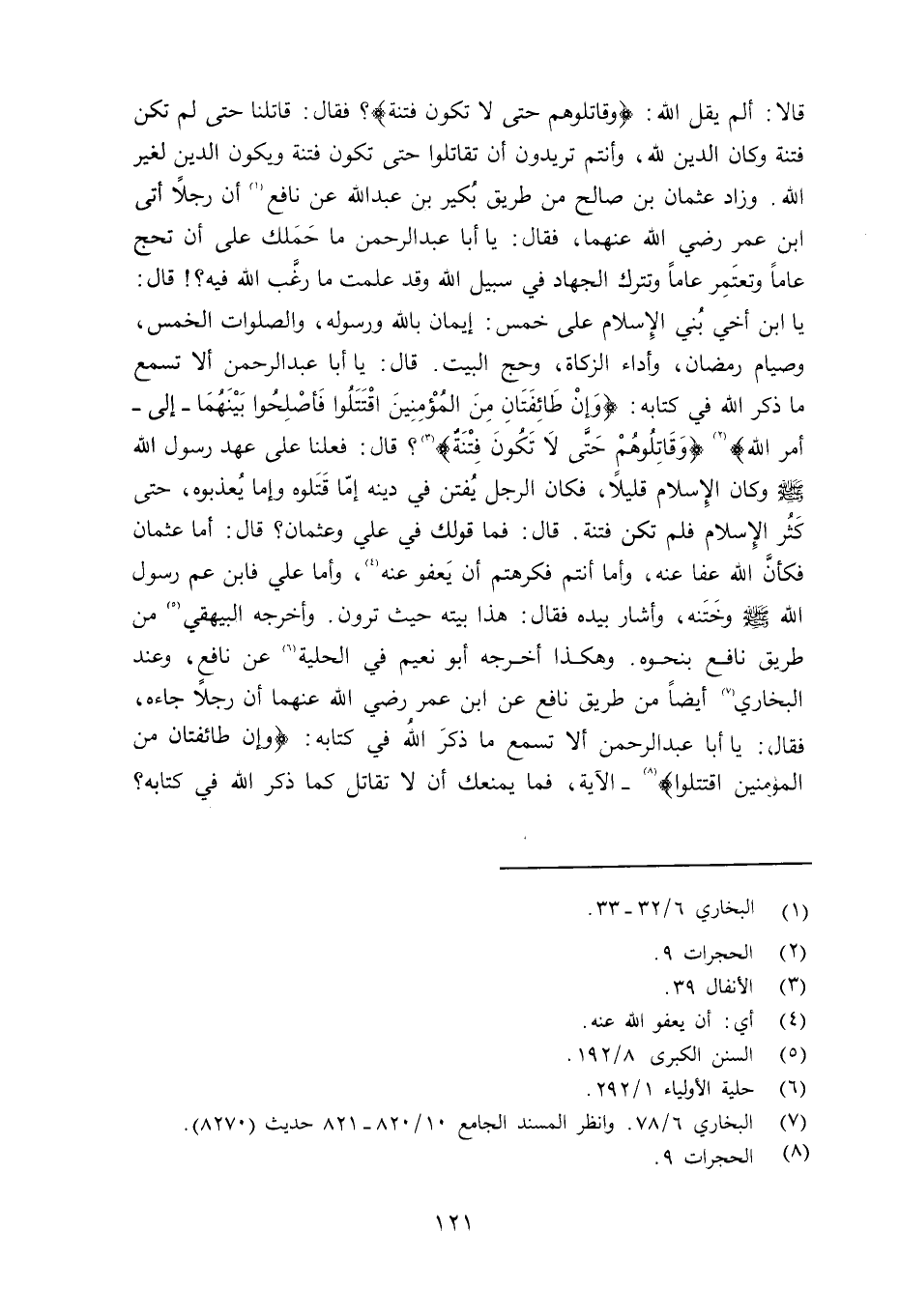 قالا: ألم يقل الله: «وقاتلوهم حتى لا تكون فتنة» ؟ فقال: قاتلنا حتى لم تكن فتنة وكان الدين لله، وأنتم تريدون أن تقاتلوا حتى تكون فتنة ويكون الدين لغير الله. وزاد عثمان بن صالح من طريق بُكير بن عبد الله عن نافع أن رجلاً أتى ابن عمر رضي الله عنهما فقال: يا أبا عبد الرحمن ما حملك على أن تحج عاماً وتعتمر عاماً وتترك الجهاد في سبيل الله (عز وجل) وقد علمت ما رغَّب الله فيه؟ قال: يا ابن أخي بُني الإِسلام على خمس: إيمان بالله ورسوله، والصلوات الخمس، وصيام رمضان، وأداء الزكاة، وحج البيت. قال: يا أبا عبد الرحمن ألا تسمع ما ذكر الله في كتابه: {وَإِن طَآئِفَتَانِ مِنَ الْمُؤْمِنِينَ اقْتَتَلُواْ فَأَصْلِحُواْ بَيْنَهُمَا} {إِلَى أَمْرِ اللَّهِ} {وَقَاتِلُوهُمْ حَتَّى لاَ تَكُونَ فِتْنَةٌ} ؟ قال: فعلنا على عهد رسول الله صلى الله عليه وسلم وكان الإسلام قليلاً، فكان الرجل يُفتن في دينه إمّا قتلوه وإما يعذبوه، حتى كثر الإِسلام فلم تكن فتنة. قال: فما قولك في علي وعثمان؟ قال: أما عثمان فكان الله عفا عنه، وأما أنتم فكرهتم أن يعفو عنه، وأما علي فابن عم رسول الله صلى الله عليه وسلم وخَتَنه، وأشار بيده فقال: هذا بيته حيث ترون. وأخجره البيهقي من طريق نافع بنحوه. وهكذا أخرجه أبو نعيم في الحلية عن نافع، وعند البخاري أيضاً من طريق نافع عن ابن عمر رضي الله عنهما أن رجلاً جاءه فقال: يا أبا عبد الرحنم ألا تسمع ما ذكر الله في كتابه: {وَإِن طَآئِفَتَانِ مِنَ الْمُؤْمِنِينَ اقْتَتَلُواْ} (سورة الحجرات، الآية: 9) - الآية، فما يمنعك أن لا تقاتل كما ذكر الله في كتابه؟