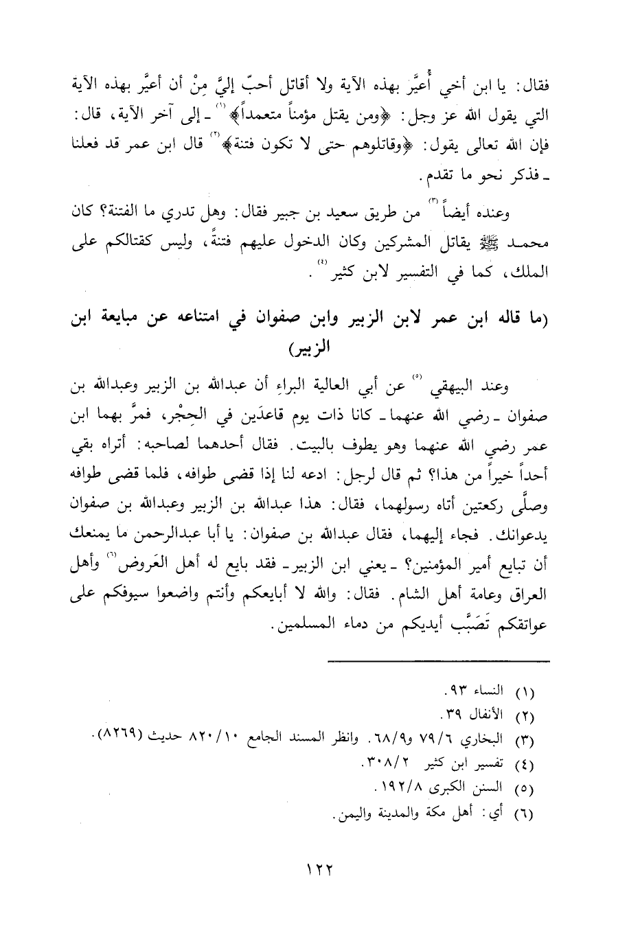 وعند البيهقي عن أبي العالية البراء أن عبد الله بن الزبير وعبد الله بن صفوان - رضي الله عنهما - كانا ذات يوم قاعدين في الحِجْر، فمرَّ بهما ابن عمر رضي الله عنهما وهو يطوف بالبيت. فقال أحدهما لصاحبه: أتراه بقي أحد خيراً من هذا؟ ثم قال لرجل: ادعه لنا إذا قضى طوافه، فلما قضى طوافه وصلَّى ركعتين أتاه رسولهما فقال: هذا عبد الله بن الزبير وعبد الله بن صفوان يدعوانك. فجاء إليهما، فقال عبد الله بن صفوان: يا أبا عبد الرحمن ما يمنعك أن تبايع أمير المؤمين؟ - يعني ابن الزبير - فقد بايع هل أهل العروض وأهل العراق وعامة أهل الشام. فقال: والله لا أبايعكم وأنتم واضعوا سيوفكم على عواتقكم تَصَبَّبَ أيديكم من دماء المسلمين.