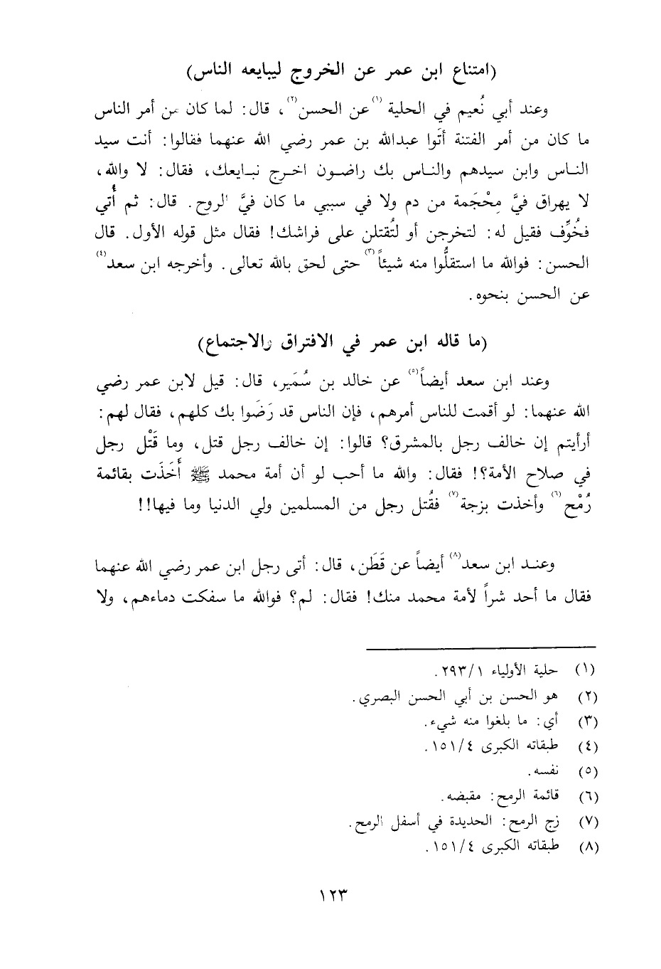 وعند ابن سعد أيضاً عن خالد بن سُمَير قال: قيل لا بن عر رضي الله عنهما: لو أقمت للناس أمرهم، فإن الناس قد رَضوا بك كلهم، فقال لهم: أرأيتم إن خالف رجل بالمشرق؟ قالوا: إن خالف رجل قتل، وما قتل رجل في صلاح الأمة؟ فقال: والله ما أحب لو أن أمة محمد صلى الله عليه وسلم أخذت بقائمة رمح وأخذت بزجه فقُتل رجل من المسلمين ولي الدنيا وما فيها وعند ابن سعد أيضاً عن قَطَن قال: أتى رجل ابن عمر رضي الله عنهما فقال ما أحد شراً لأمة محمد منك فقال: لم؟ فوالله ما سفكت دماءهم، ولا