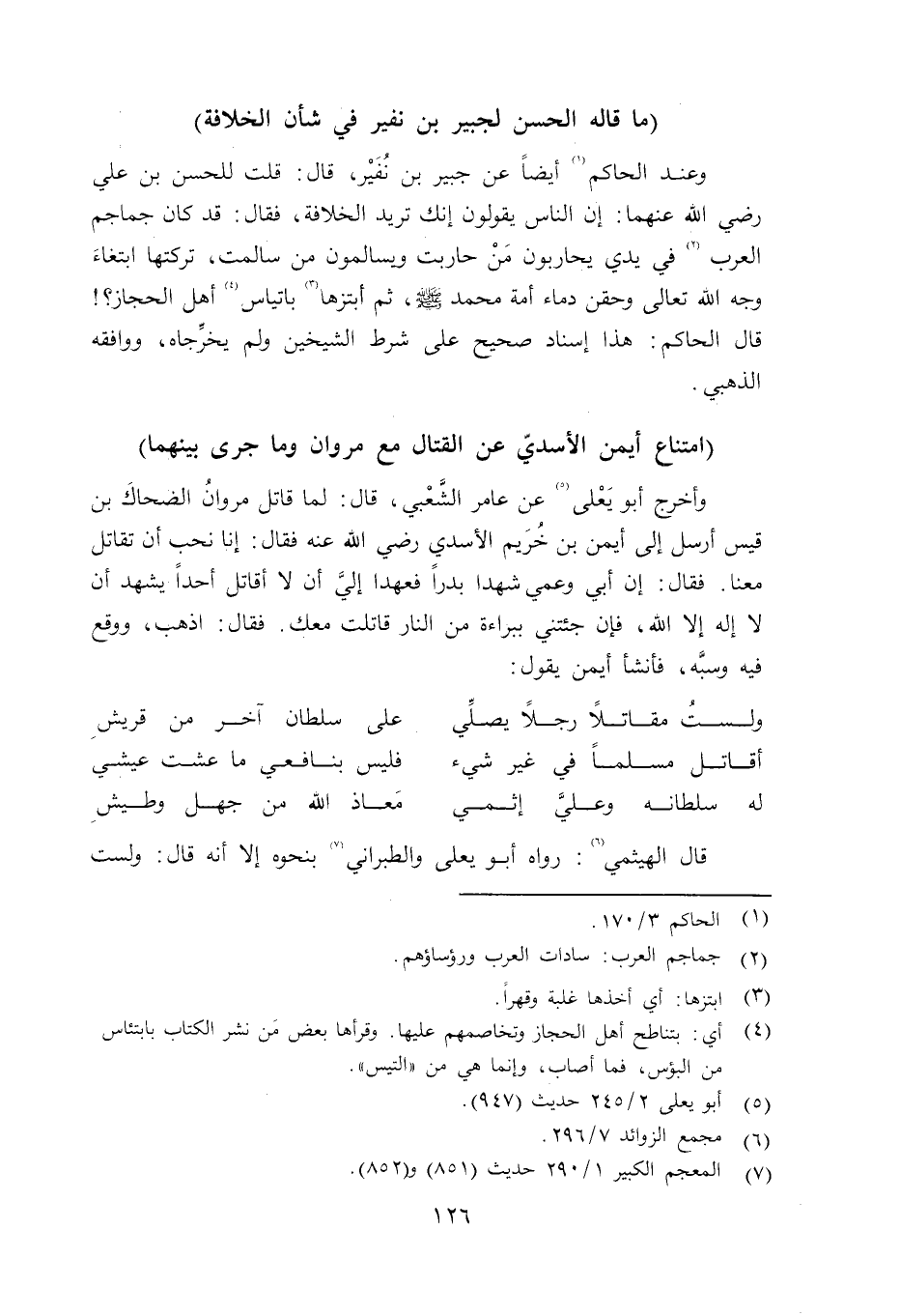 وعند الحاكم أيضاً عن جبير بن نفير رضي الله عنه قال: قلت للحسن بن علي رضي الله عنهما: إن الناس يقولون إنك تريد الخلافة، فقال: قد كان جماجم العرب في يدي يحاربون مَنْ حاربت ويسالمون من سالمت، تركتها ابتغاءَ وجه الله تعالى وحقن دماء أمة محمد صلى الله عليه وسلم ثم أبتزها باتئاس أهل الحجاز؟ قال الحاكم: هذا إسناد صحيح على شرط الشيخين ولم يخرِّجاه، ووافقه الذهبي.