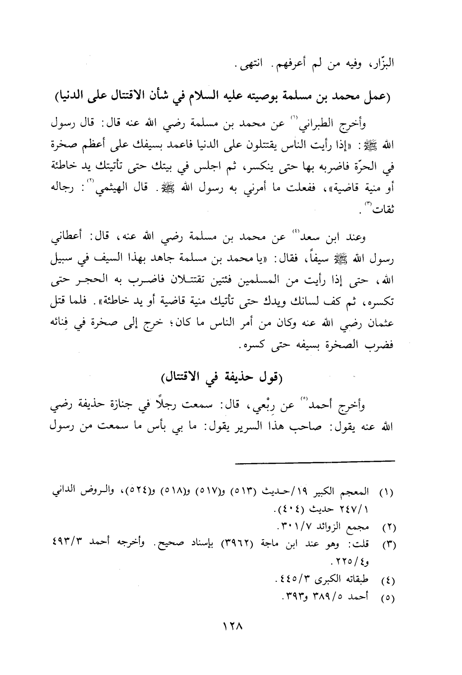وأخرج الطبراني عن محمد بن مسلمة رضي الله عنه قال: قال رسول الله صلى الله عليه وسلم «إذا رأيت الناس يقتتلون على الدنيا فاعمد بسيفك على أعظم صخرة في الحرّة فاضربه بها حتى ينكسر، ثم اجلس في بيتك حتى تأتيك يد خاطئة أو منية قاضية» ، ففعلت ما أمري به رسول الله صلى الله عليه وسلم قال الهيثمي رجاله ثقات.
