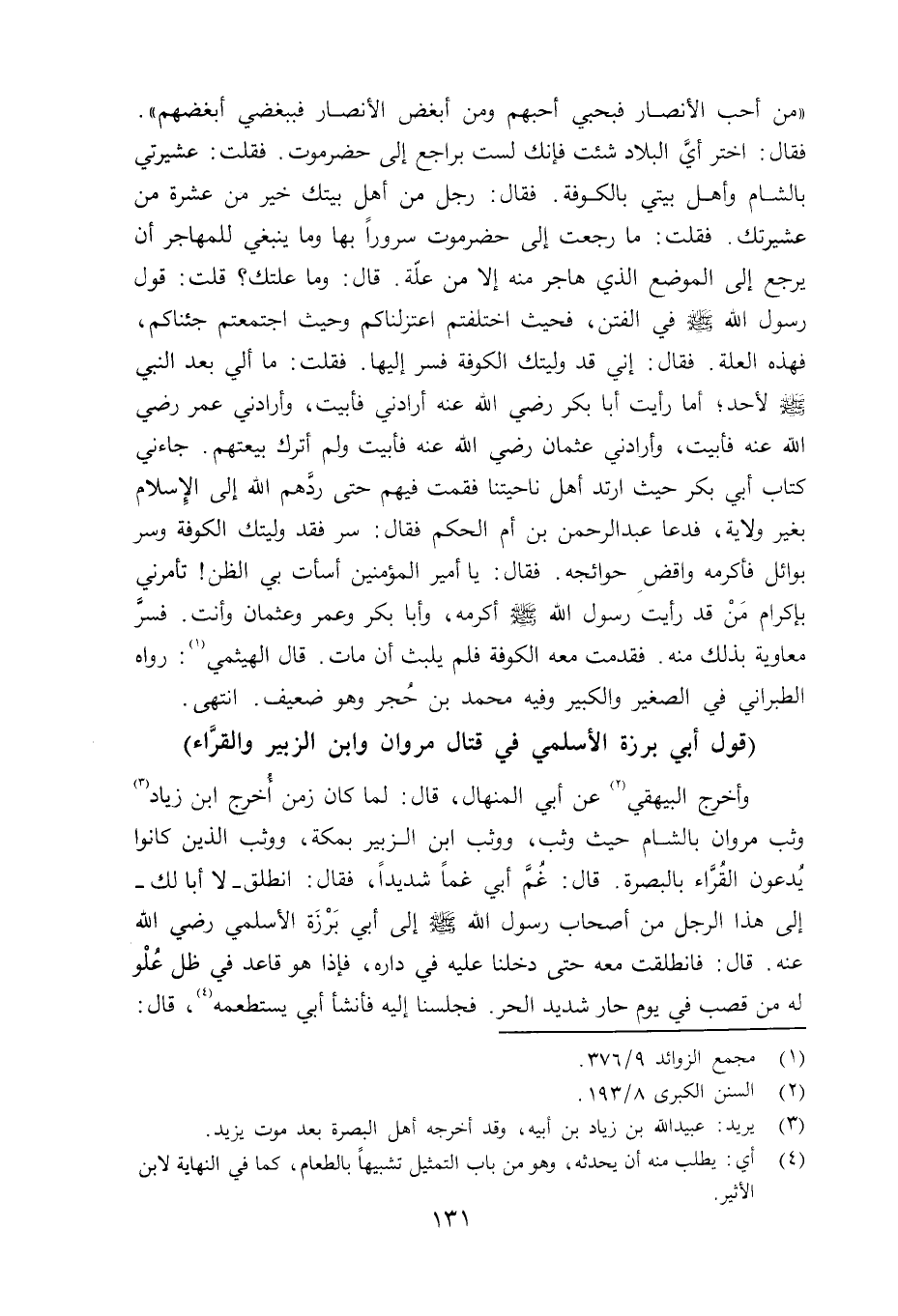 وأخرج البيهقي عن أبي المنهال قال: لما كان زمن أُخرج ابن زياد وثبت مروان بالشام حيث وثب، ووثب ابن الزبير بمكة، ووثب الذين كانوا يُدعون القُرَّاء بالبصرة. قال: غُمَّ أبي غماً شديداً، فقال: انطلق - لا أبالك - إلى هذا الرجل من أصحاب رسول الله صلى الله عليه وسلم إلى أبي بَرْزَة الأسلمي رضي الله عنه. قال: فانطلقت معه حتى دخلنا عليه في داره، فإذا هو قاعد في ظل عُلْوٍ له من قصب في يوم حار شديد الحر. فجلسنا إليه فأنشأ أبي يستطعمه، قال: