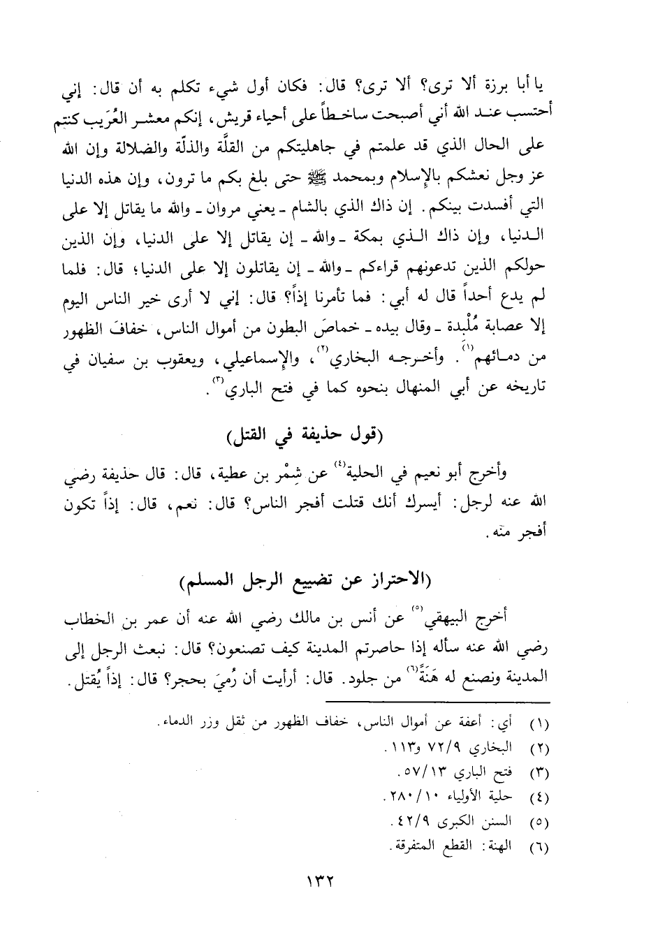 يا أبا برزة ألا ترى؟ ألا ترى؟ قال: فكان أول شيء تكلم به أن قال: إني أتسب عند الله أني أصبحت ساخطاً على أحياء قريش، إنكم معشر العُرَيب كنتم على الحال الذي قد علمتم في جاهليتكم من القلَّة والذلّة والضلالة وإن الله عز وجل نعشكم بالإِسلام وبمحمد صلى الله عليه وسلم حتى بلغ بكم ما ترون، وإن هذه الدنيا التي أفسدت بينكم. إن ذاك الذي بالشام - يعني مروان - والله ما يقاتل إلا على الدنيا، وإن ذاك الذي بمكة - والله - إن يقاتل إلا على الدنيا، وإن الذين حولكم الذين تدعونهم قراءكم - والله - إن يقاتلون إلا على الدنيا؛ قال: فلما لم يدع أحداً قال له أبي: فما تأمرنا إذاً؟ قال: إني لا أرى خير الناس اليوم إلا عصابة مُلْبِدة - وقال بيده - خماصَ البطون من أموال الناس، خفافَ الظهور من دمائهم. وأخرجه البخاري، والإِسماعيلي، ويعقوب بن سفيان في تاريخه عن أبي المنهال بنحوه كما في فتح الباري.