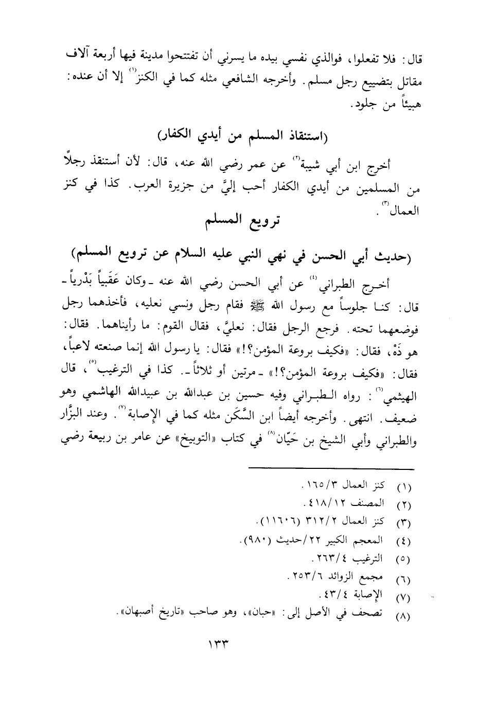 أخرج ابن أبي شيبة عن عمر رضي الله عنه قال: لأن استنقذ رجلاً من السملمين من أيدي الكفار أحب إليَّ من جزيرة العرب. كذا في كنزل العمال.