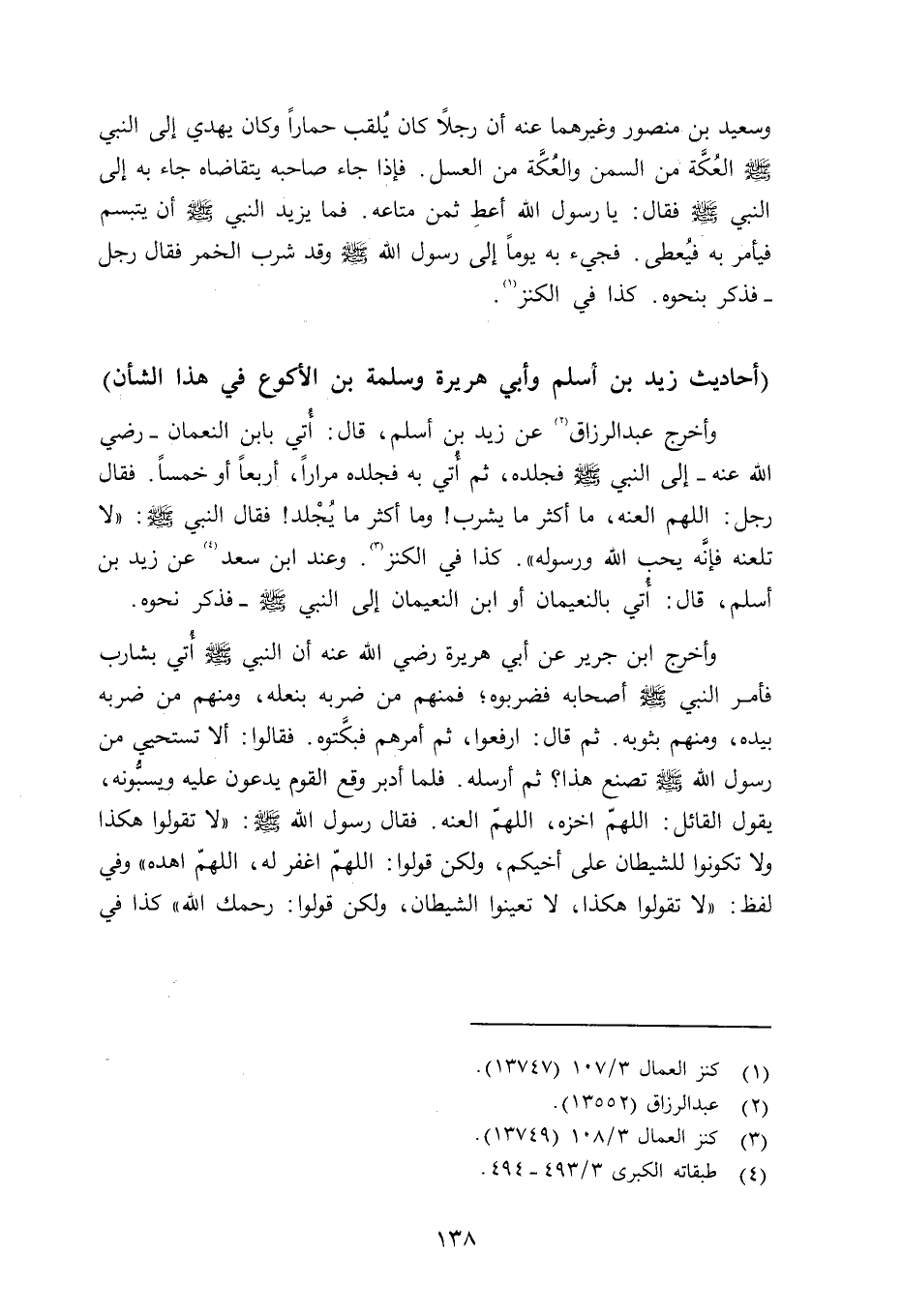 وأخرج عبد الرزاق عن زيد بن أسلم قال: أُتي بابن النعمان - رضي الله عنه - إلى النبي صلى الله عليه وسلم فجلده، ثم أُتي به فجلده مراراً، أربعاً أو خسماً. فقال رجل: اللهمَّ العنه، ما أكثر ما يشرب وما أكثر ما يجلد فقال النبي صلى الله عليه وسلم «لا تلعنه فإنَّه يحب الله ورسوله» . كذا في الكنز. وعند ابن سعد عن زيد بن أسلم قال: أُتي بالنعيمان أو ابن النعيمان إلى النبي صلى الله عليه وسلم ـ فذكر نحوه.