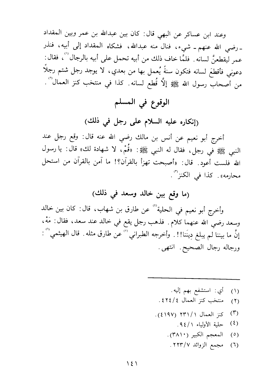 أخرج أبو نعيم عن أنس بن مالك رضي الله عنه قال: وقع رجل عند النبي صلى الله عليه وسلم في رجل، فقال له النبي صلى الله عليه وسلم «قُمْ، لا شهادة لك» قال: يا رسول الله فلست أعود. قال: «أصبحت تهزأ بالقرآن؟ ما آمن بالقرآن من استحل محارمه» . كذا في الكنز.