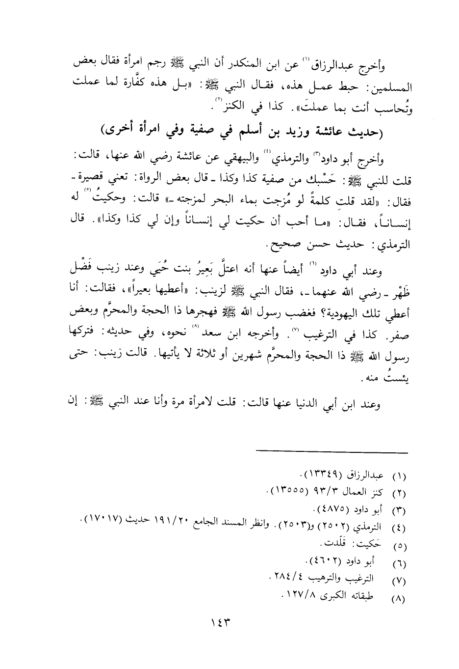 وأخرج أبو داود والترمذي والبيهقي عن عائشة رضي الله عنها قالت: قلت للنبي صلى الله عليه وسلم حَسْبك من صفية كذا وكذا - قال بعض الرواة: تعني قصيرة - فقال: «لقد قلت كلمة لو مُزجت بماء البحر لمزجته -» قالت: وحكيتُ له إنساناً، فقال: «ما أحب أن حكيت لي إنساناً وإن لي كذا وكذا» . قال الترمذي: حديث حسن صحيح. وعند أبي داود أيضاً عنها أنه اعتلَّ بعير لصفية بنت حُيَي وعند زينب فَضْل ظَهْر - رضي الله عنهما -، فقال النبي صلى الله عليه وسلم لزينب: «أعطيها بعيراً» ، فقالت: أنا أعطي تلك اليهودية؟ فغضب رسول الله صلى الله عليه وسلم فهجر ذا الحجة والمحرَّم وبعض صفر. كذا في الترغيب. وأخرجه ابن سعد نحوه، وفي حديثه: فتركها رسول الله صلى الله عليه وسلم ذا الحجة والمحرَّم شهرين أو ثلاثة لا يأتيها. قالت زينب: حتى يئستُ منه.