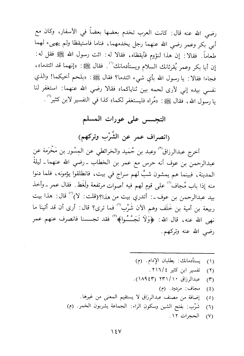أخرج عبد الرزاق وعبد بن حُمَيد والخرائطي عن المِسْور بن مَخْرَمة عن عبد الرحمن بن عوف أنه حرس مع عمر بن الخطاب - رضي الله عنهما - ليلةً المدينة، فبينما هم يمشون شبَّ لهم سراج في بيت، فانطلقوا يؤمونه، فلما دنوا منه إذاباب مُجاف على قوم لهم فيه أصوات مرتفعة ولَغَط. فقال عمر -وأخذ بيد عبد الرحمن بن عوف -: أتدري بيت من هذا؟ قال: هذا بيت ربيعة بن أمية بن خَلَف وهم الآن شَرْب فما ترى؟ قال: أرى أن قد أتينا ما نهى الله عنه، قال الله: {وَلاَ تَجَسَّسُواْ} (سورة الحجرات: الآية: 12) فقد تجسسنا فانصرف عنهم عمر رضي الله عنه وتركهم.