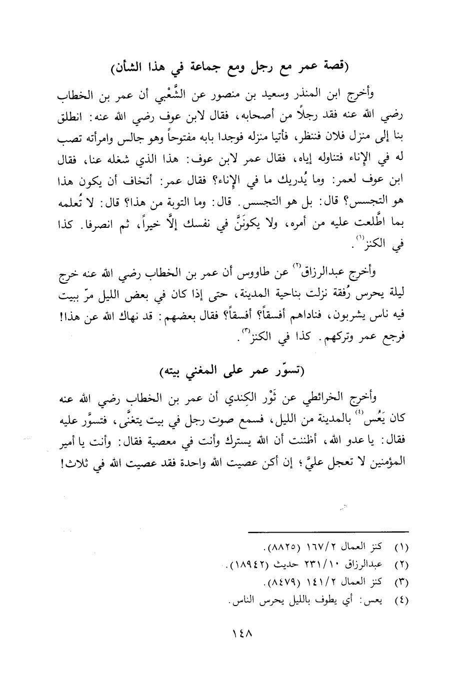 وأخرج عبد الرزاق عن طاووس أن عمر بن الخطاب رضي الله عنه خرج ليلة يحرس رُفقة نزلت بناحية المدينة، حتى إذا كان في بعض الليل مر ببيت فيه ناس يشربون، فناداهم أفسقاً؟ أفسقاً؟ فقال بعضهم: قد نهاك الله عن هذا فرجع عمر وتركهم. كذا في الكنز.