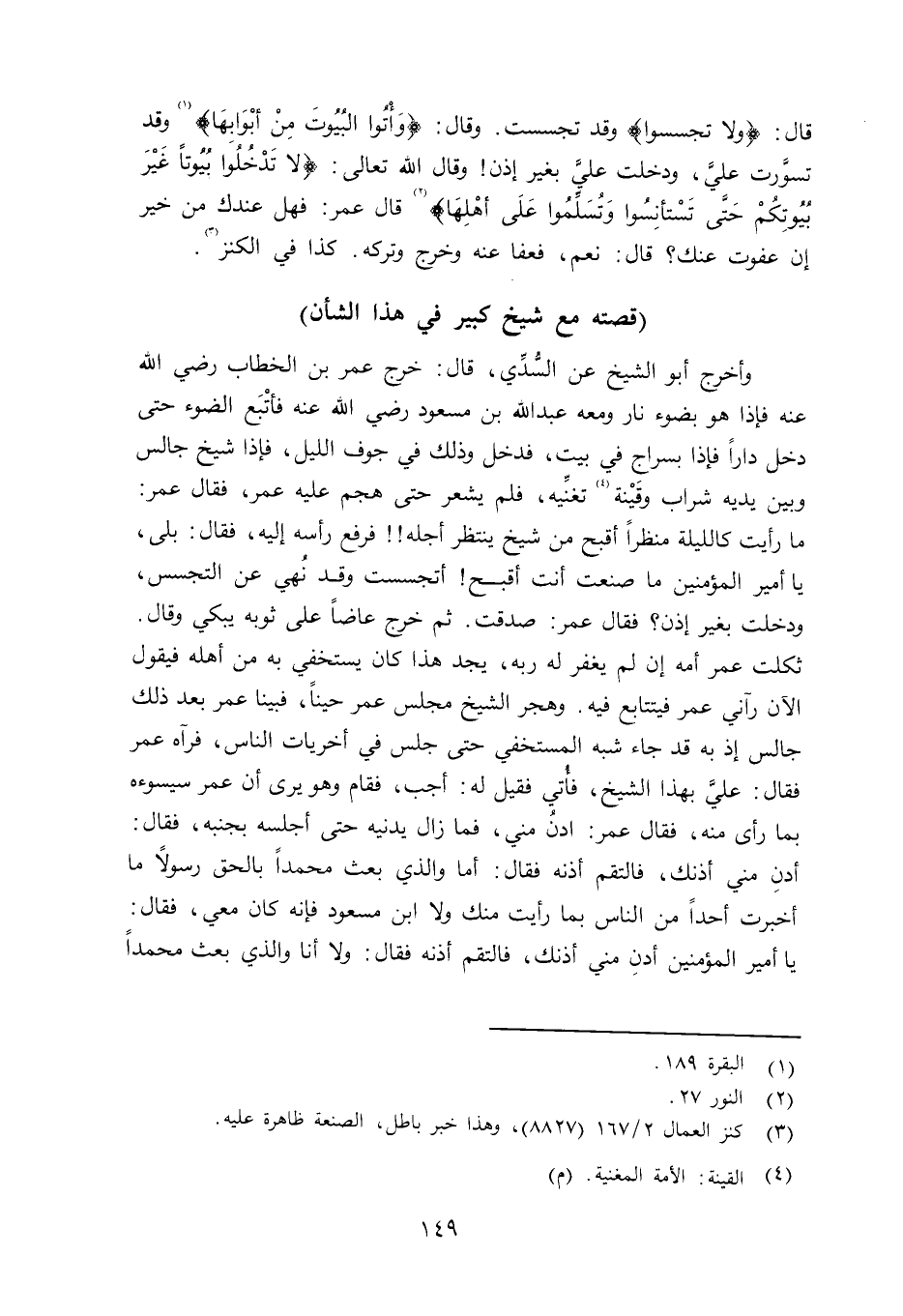 وأخرج أبو الشيخ عن السُّدِّي قال: خرج عمر بن الخطاب رضي الله عنه فإذا هو بضوء نار ومعه عبد الله بن مسعود رضي الله عنه فأتْبَع الضوء حتى دخل داراً فإذا بسراج في بيت، فدخل وذلك في جوف الليل، فإذا شيخ جالس وبين يديه شراب وقَيْنة تغنِّيه، فلم يشعر حتى هجم عليه عمر، فقال عمر: ما رأيت كالليلة منظراً أقبح من شيخ ينتظر أجله فرفع رأسه إليه، فقال: بلى، يا أمير المؤمنين ما صنعت أنت أٌبح أتجسست وقد نُهي عن التجسس، ودخلت بغير إذن؟ فقال عمر: صدقت. ثم خرج عاضاً على ثوبه يبكي وقال: ثكلت عمر أمه إن لم يغفر له ربه، يجد هذا كان يستخفي به من أهله فيقول الآن رآني عمر فيتتابع فيه. وهجر الشيخ مجلس عمر حيناً، فبينا عمر بعد ذلك جالس إذ به قد جاء شبه المستخفي حتى جلس في أخريات الناس، فرآه عمر فقال: عليَّ بهذا اشيخ، فأُتي فقيل له: أجب، فقام وهو يرى أن عمر سيسوءه بما رأى منه، فقال عمر: ادنُ مني، فما زال يدنيه حتى أجلسه بجنبه، فقال: إدنِ مني أذنك، فالتقم أذنه فقال: أما والذي بعث محمداً