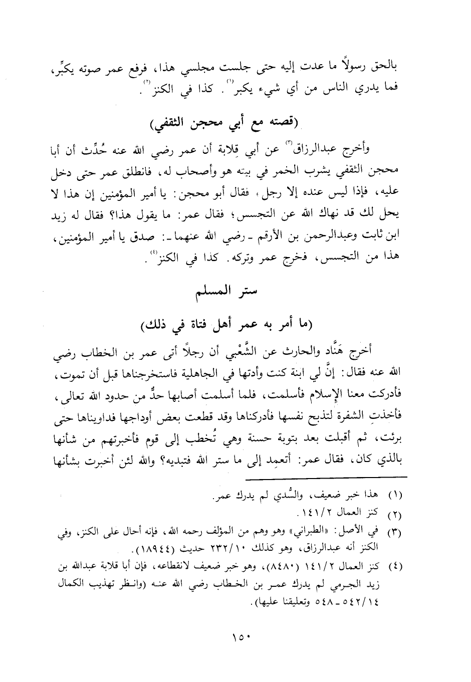 وأخرج الطبراني عن أبي قِلابة أن عمر رضي الله عنه حُدِّث أن أبا محجن الثقفي يشرب الخمر في بيته هو وأصحاب له، فانطلق عمر حتى دخل عليه، فإذا ليس عنده إلا رجل، فقال أبو محجن: يا أمير المؤمنين إن هذا لا يحل لك قد نهاك الله عن التجسس؛ فقال عمر: ما يقول؟ فقال له زيد بن ثابت وعبد الرحمن بن الأرقم - رضي الله عنهما -: صدق يا أمير المؤمنين، هذا من التجسس، فخرج عمر وتركه. كذا في الكنزل.