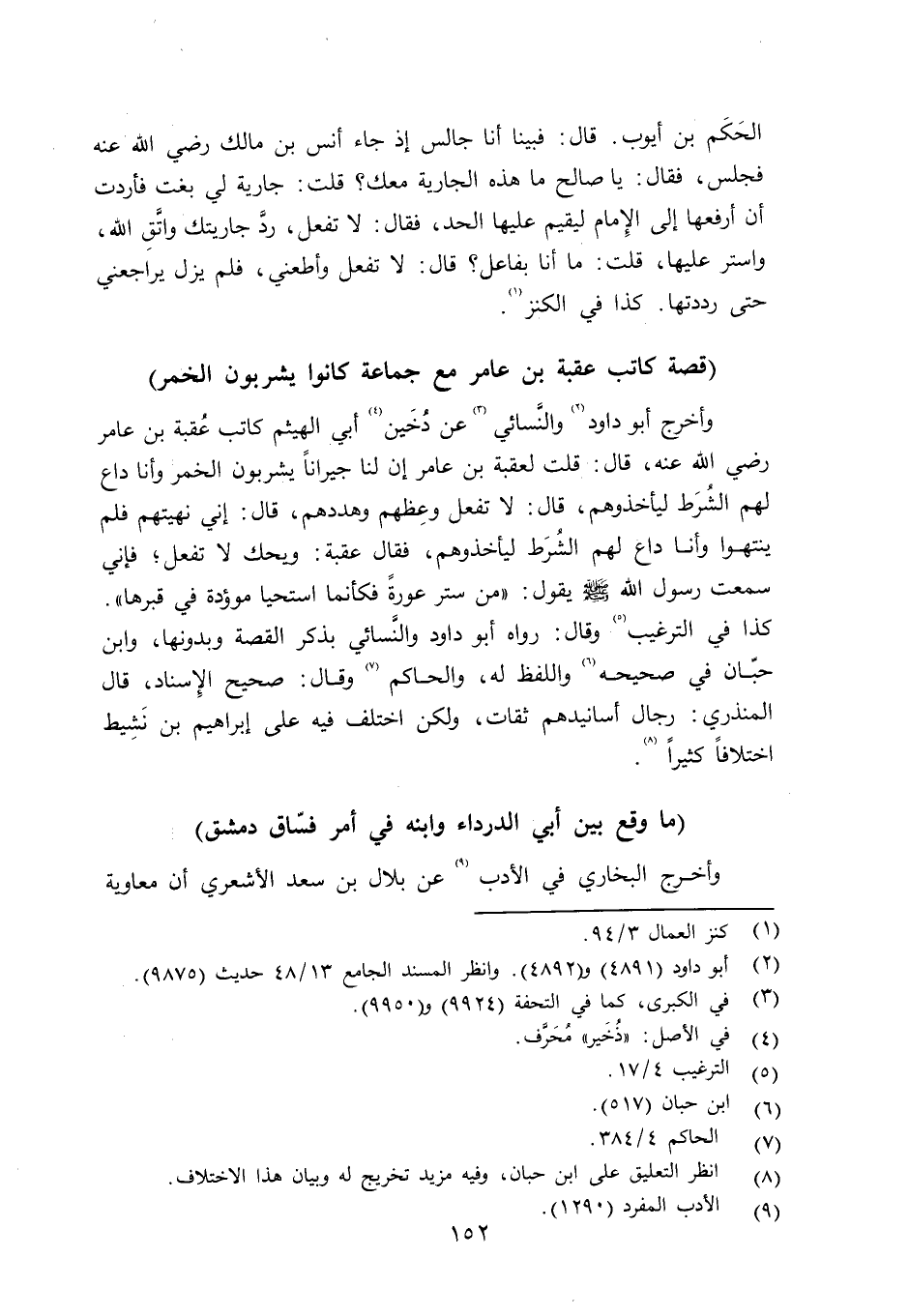وأخرج أبو داود والنِّسائي عن دُخَير أبي الهيثم كانت عُقبة بن عامر رضي الله عنه قال: قلت لعقبة بن عامر إن لنا جيراناً يشربون الخمر وأنا داع لهم الشرط ليأخذوهم، قال: لا تفعل وعِظهم وهددهم، قال: إني نهيتهم فلم ينتهوا وأنا داع لهم الشُرَط ليأخذوهم، فقال عقبة: ويحكم لا تفعل؛ فإني سمعت رسول الله صلى الله عليه وسلم يقول: «من ستر عورة فكأنما استحيا مؤودة في قبرها» كذا في الترغيب وقال: رواه أبو داود والنِّسائي بذكر القصة وبدونها، وابن حبّان في صحيحه واللفظ له، والحاكم وقال: صحيح الإِسناد، قال المنذري: رجال أسانيدهم ثقات، ولكن اختلف فيه على إبراهيم بن نَشِيط اختلافاً كثيراً.
